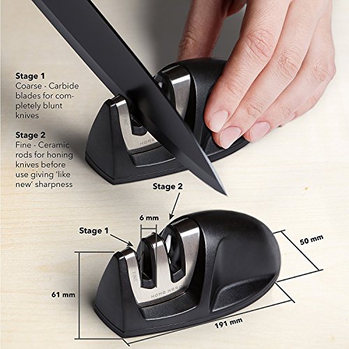 - Includes a knife sharpener with two sharpening modes (fine and coarse sharpening) and elegant acrylic stand