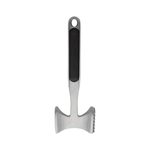 Details: This versatile KitchenAid meat tenderizer will tenderize or flatten meat for your favorite recipe. Features both a flat and a raised surface for all types and cuts of meat. The soft grip handle provides a comfortable experience when using the tenderizer. Also a useful tool for crushing spices. Hand wash. Measures 11 inch long.