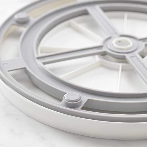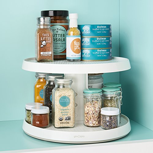 Brand: YouCopiaColor: WhiteFeatures: Two-tier turntable makes it easy to organize more bottles in the kitchen or bathroom; fits standard cabinets Adjustable height levels, 6 or 7-inch openings so you can create the perfect fit and maximize your vertical space Center support ensures all items stay visible for quick selection; non-slip...