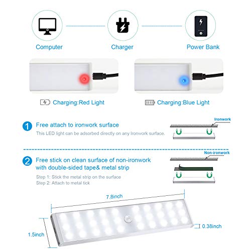 - [Easier Installation] Rechargeable cabinet light with built-in magnetic& 3M adhesive strip; Just stick closet lighting on smooth & dry surface of cabinet, you will find this under counter lights easy to mount and flexible to detach for charging; Only 5 seconds for a big change!