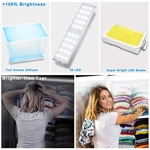 - [+100% BRIGHTNESS] New version 30 LED closet light, 400LM, illuminates your closet brighter than ever; Broadened full screen diffuser adds 100% illumination area in the closet& cabinet easy to choose the right color& stuff at a glance