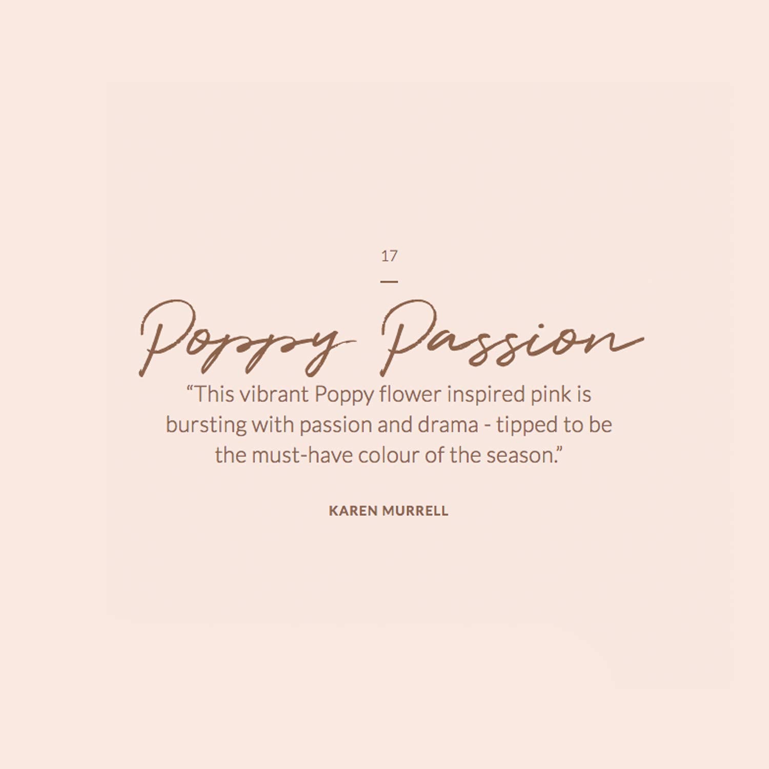 • 17 POPPY PASSION - Dare to color your world an effervescent shade of pink with the intense fuchsia hue and romantic red undertones of Poppy Passion, an exquisite lipstick reminiscent of the vibrancy of the Passion Flower