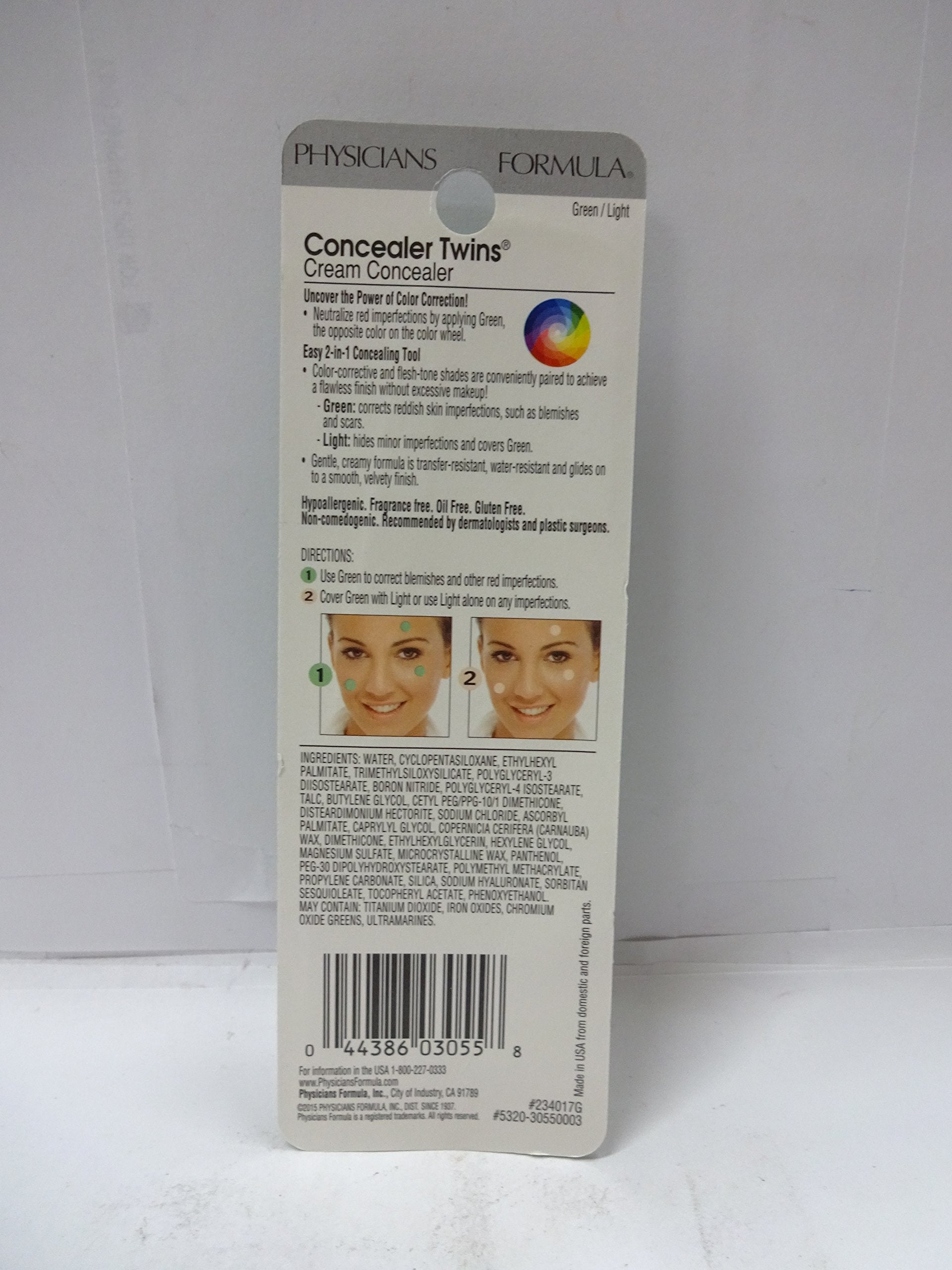 • Getting that flawless skin is now fairly easy. Physicians Formula Concealer Twins Cream Concealers effectively unites a color corrective and a light, flesh-tone cream concealer that easily blends in with your natural skin color, giving you a spotless appearance. The yellow color masks under-eye circles and other bluish skin discolorations; the green color hides red blemishes and scars. Any minor skin imperfections are concealed with this formula and its water-resistant quality prevents it from rubbing off.