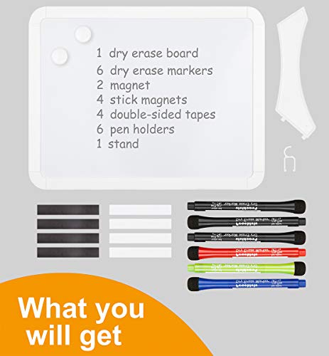 - Includes – 1 dry erase board, 6 dry erase markers, 2 magnet, 4 double-sided tape, 4 stick magnets, 1 stand.
