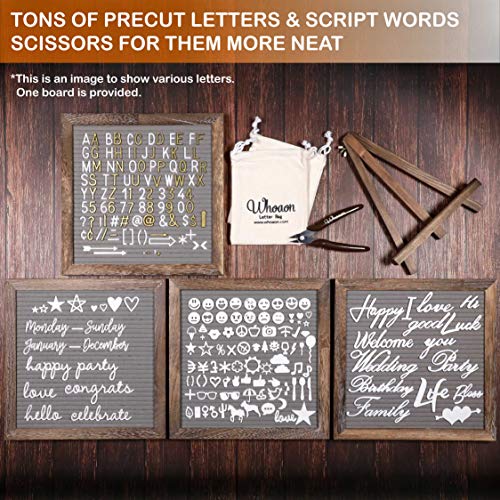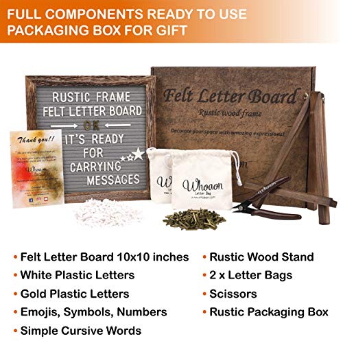 Details: The Rustic Frame Gray Felt Letter board includes: +296 White Characters Including Letters, Numbers, Symbols, and Emojis +145 White Characters Including Letters, Numbers, Symbols, and Emojis 12 Months & 7 Days cursive phrases / +50 Additional Emojis Character Set Letters come pre-cut and scissors are included with it for easy trimming. 2 Cloth Drawstring Pouches to Hold Many Characters. Sawtooth Hanger on the back side of the board Rustic Style Vintage Wood Stand. Vintage Processed Wood Frame Premium Gray Felt Backing Anywhere It Can Be: Arts and Crafts Store Displays and Signage Business Presentation Supplies Classroom Materials Farmhouse Decoration Gift for family or friends Child teaching tool to learn spelling Versatile and stylish shabby chic design