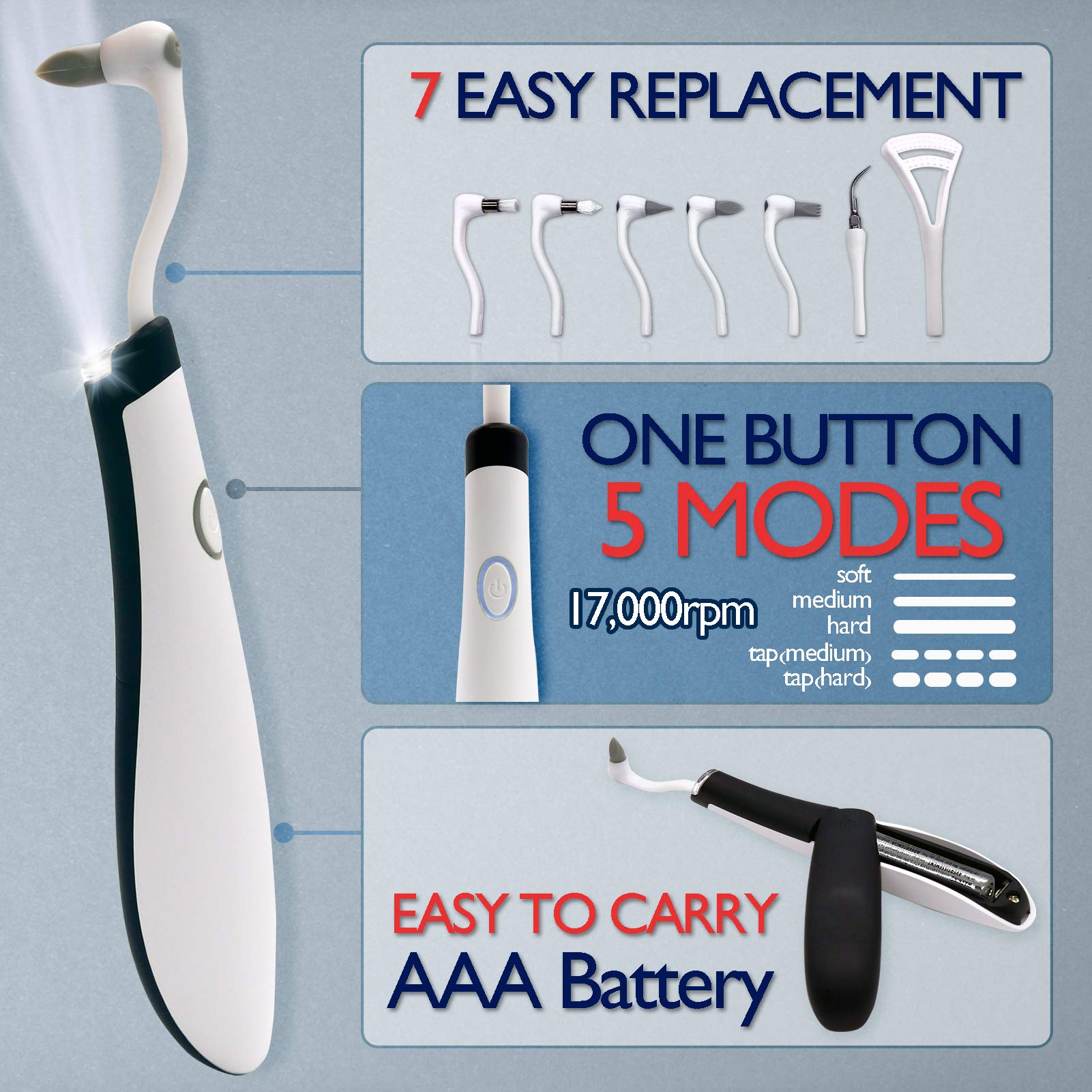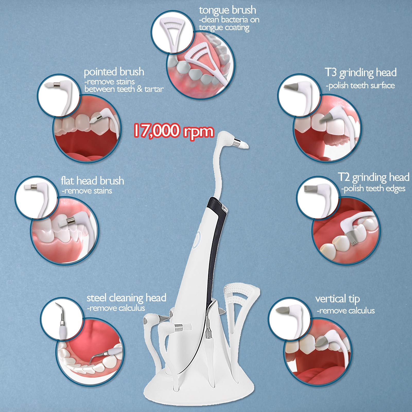 - 🟢5 SPEED MODES with HIGH FREQUENCY VIBRATION & LED LIGHT: With built-in LED light, this upgraded version teeth plaque remover is more convenient to clean every corner of your mouth, and has 5 cleaning modes (weak, medium strong, and 2 conversion modes) are very suitable for different gingival sensitivities, helps you get away from tartar to plaque and teeth stains. High frequency vibration (17000RPM) is more effective in cleaning your teeth.