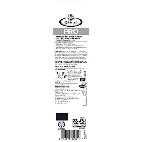 Details: Spinbrush Battery Toothbrushes have a patented dual action brush head, featuring two moving parts to help clean deep between your teeth and gums, for superior cleaning. Never wonder when you need to change your brush head again! ARM & HAMMER Spinbrush Pro Clean battery toothbrush features replaceable brush heads with Color-Wear bristles: See the colors fade when it’s time to switch them out. Then, just pop one on to continue removing 70% more plaque in hard-to-reach places. Keep your brush spinning with ARM & HAMMER Spinbrush Pro Clean Refills. Spinbrush toothbrushes are approved by the ADA, American Dental Association, so you can have the confidence they are safe an effective. And, ARM & HAMMER Spinbrush uses DURACELL batteries, which are included in each brush handle and easily replaceable. Brush with confidence with Spinbrush.