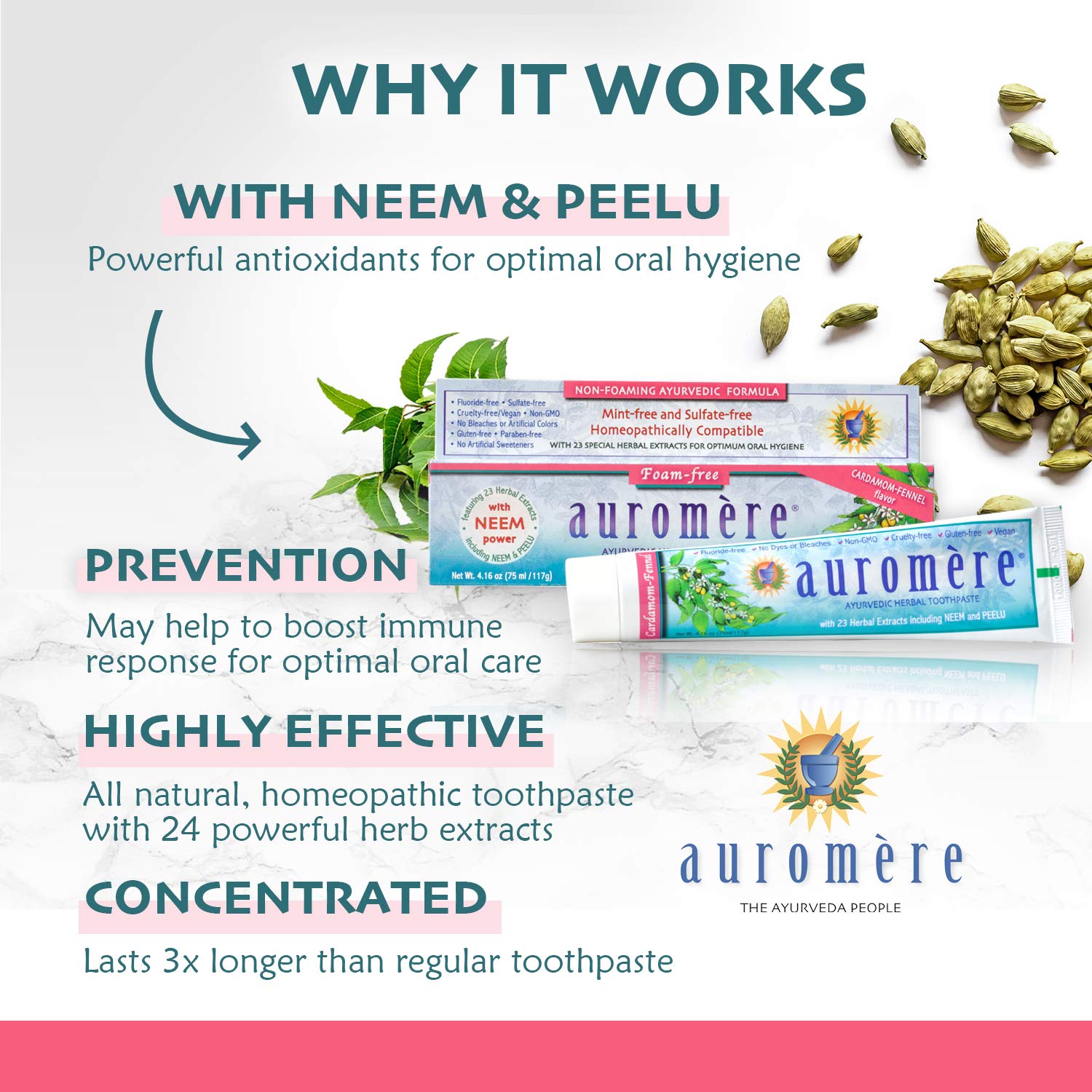 Auromere Ayurvedic Herbal Toothpaste, Cardamom Fennel, Foam Free - Vegan, Natural, Non GMO, SLS Free, Fluoride Free, Gluten Free, with Neem & Peelu (4.16 oz), 3 Pack by Auromere Store