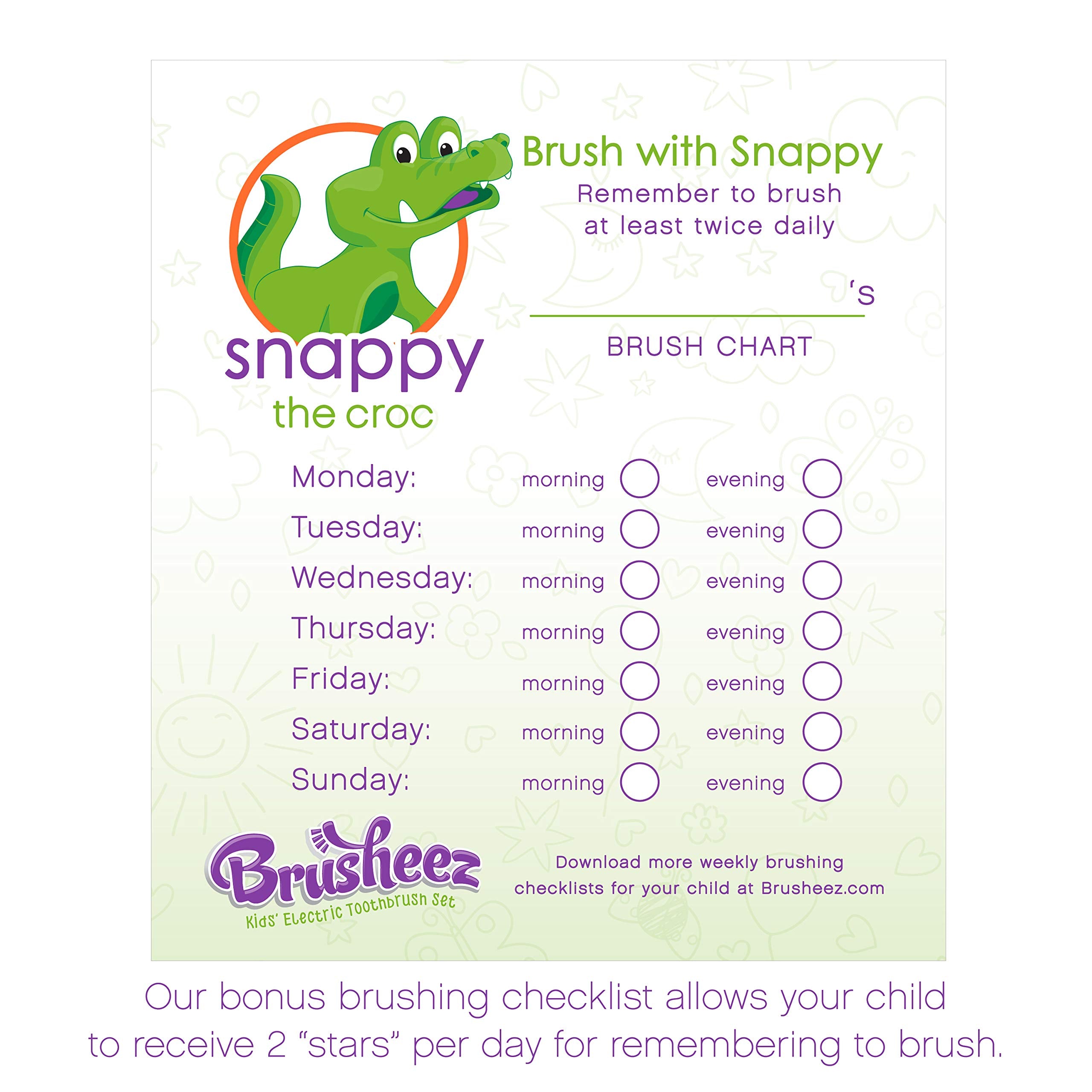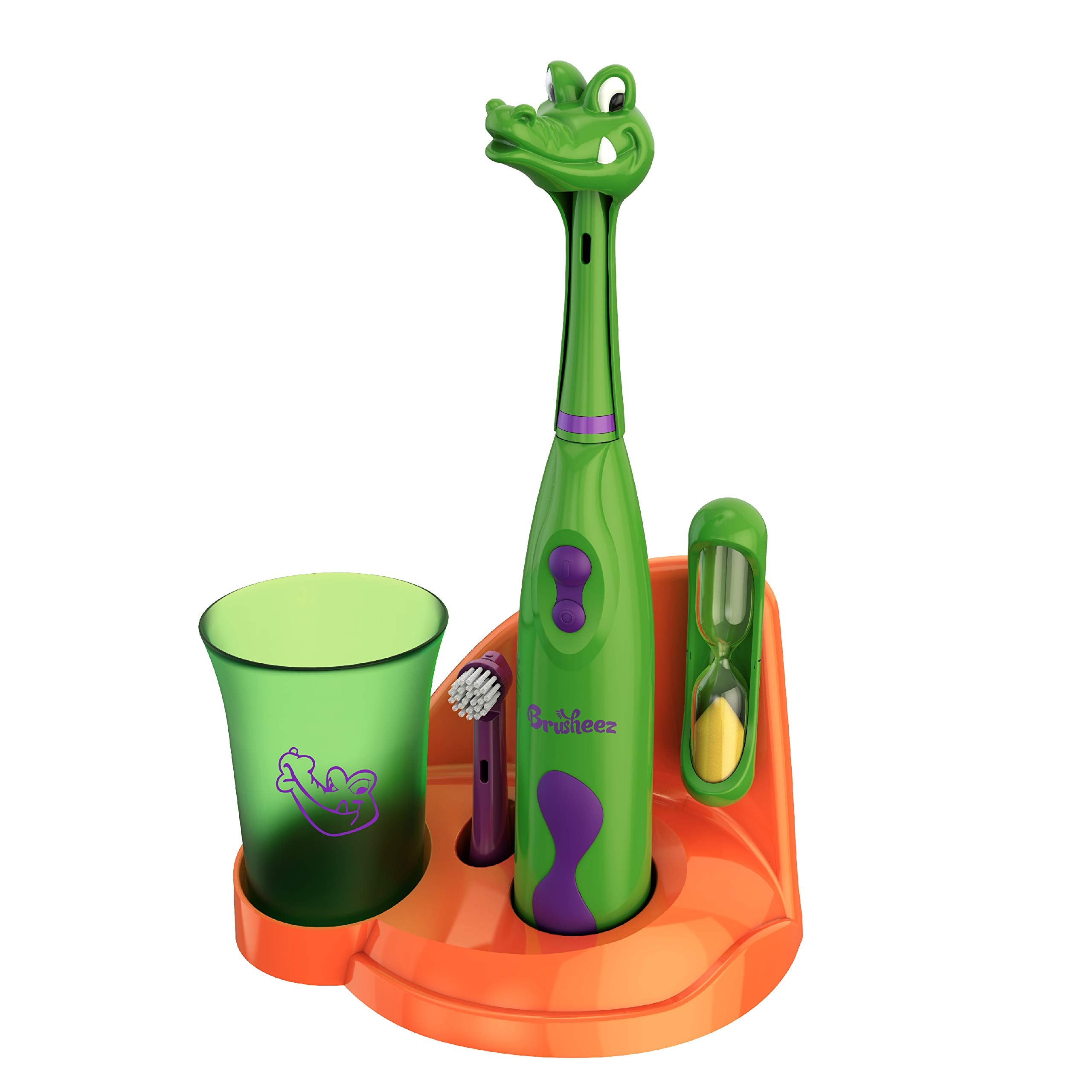 Brusheez® Kids Electric Toothbrush Set (Safari Edition) - Battery Operated, Soft Bristles, Easy On/Off, 2 Brush Heads, Animal Cover, Sand Timer, Rinse Cup, and Base - Ages 3+ (Snappy The Croc) by Brusheez Store