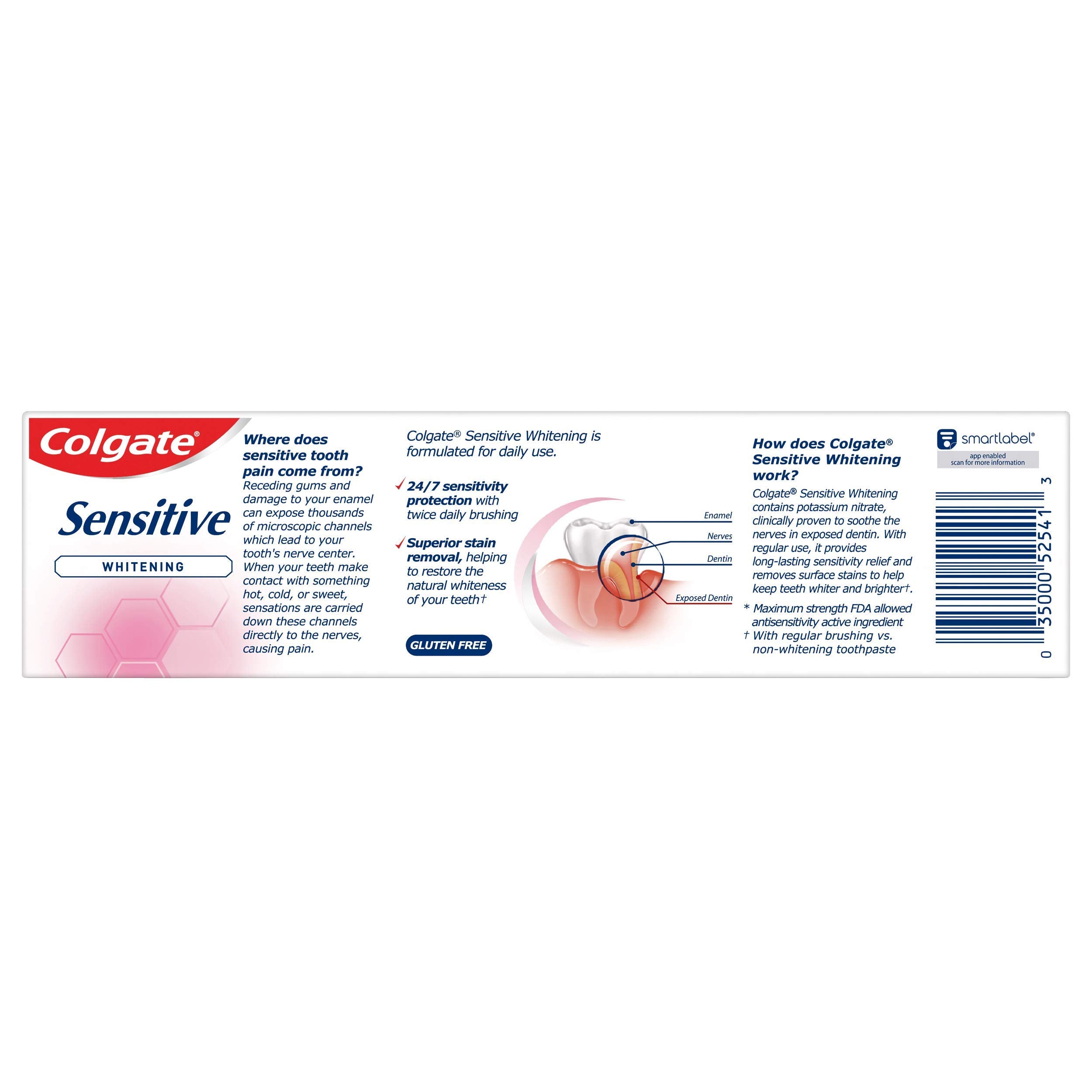Colgate Sensitive Whitening toothpaste provides 24/7 sensitivity protection with twice-daily brushing. This sensitive teeth toothpaste contains potassium nitrate, clinically proven to soothe the nerves in exposed dentin. With regular use, it provides long-lasting sensitivity relief and removes surface stains to help keep teeth whiter and brighter (with regular brushing vs. non- whitening toothpaste). Plus Colgate Sensitive Whitening toothpaste helps repair weakened enamel, protect teeth from cavities and provides the freshness you trust from Colgate.