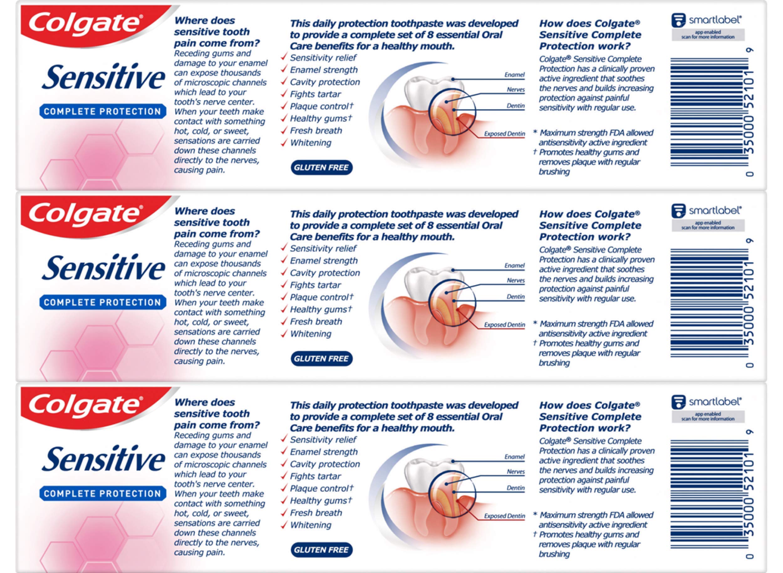 Colgate Sensitive Complete Protection toothpaste provides 24/7 sensitivity protection with twice daily brushing and was developed to help protect against cavities, fight tartar and remove plaque with regular brushing. This sensitive toothpaste contains potassium nitrate, clinically proven to soothe the nerves in exposed dentin. With regular use, it provides long lasting sensitivity relief. Plus Colgate Sensitive Complete Protection toothpaste is formulated to help strengthen enamel, whiten teeth, freshen breath and promote healthy gums with regular brushing.