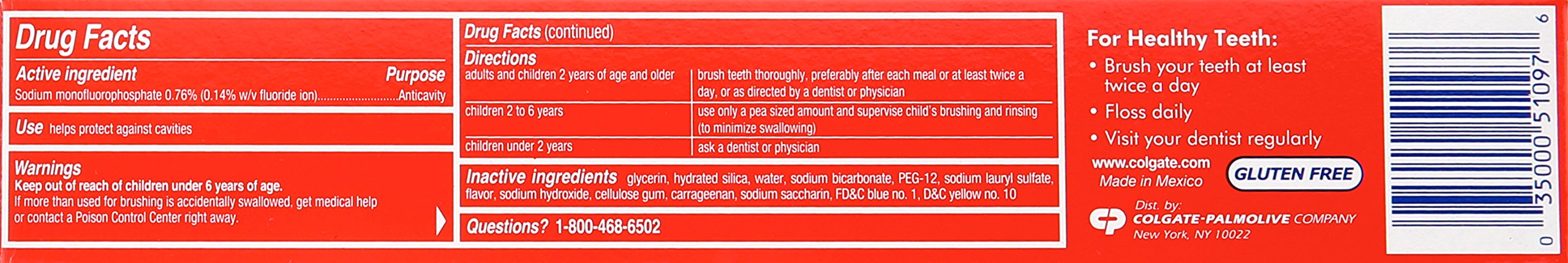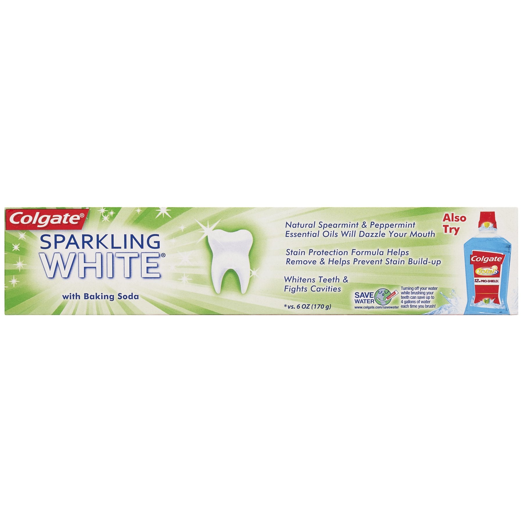 Colgate Sparkling White Mint Zing Gel toothpaste is formulated with natural spearmint and peppermint essential oils that will dazzle your mouth. This stain protection formula with baking soda, whitens and helps prevent stain build-up. Plus, it fights cavities accompanied by a unique flavor experience for a sparkling, healthy and whiter smile.