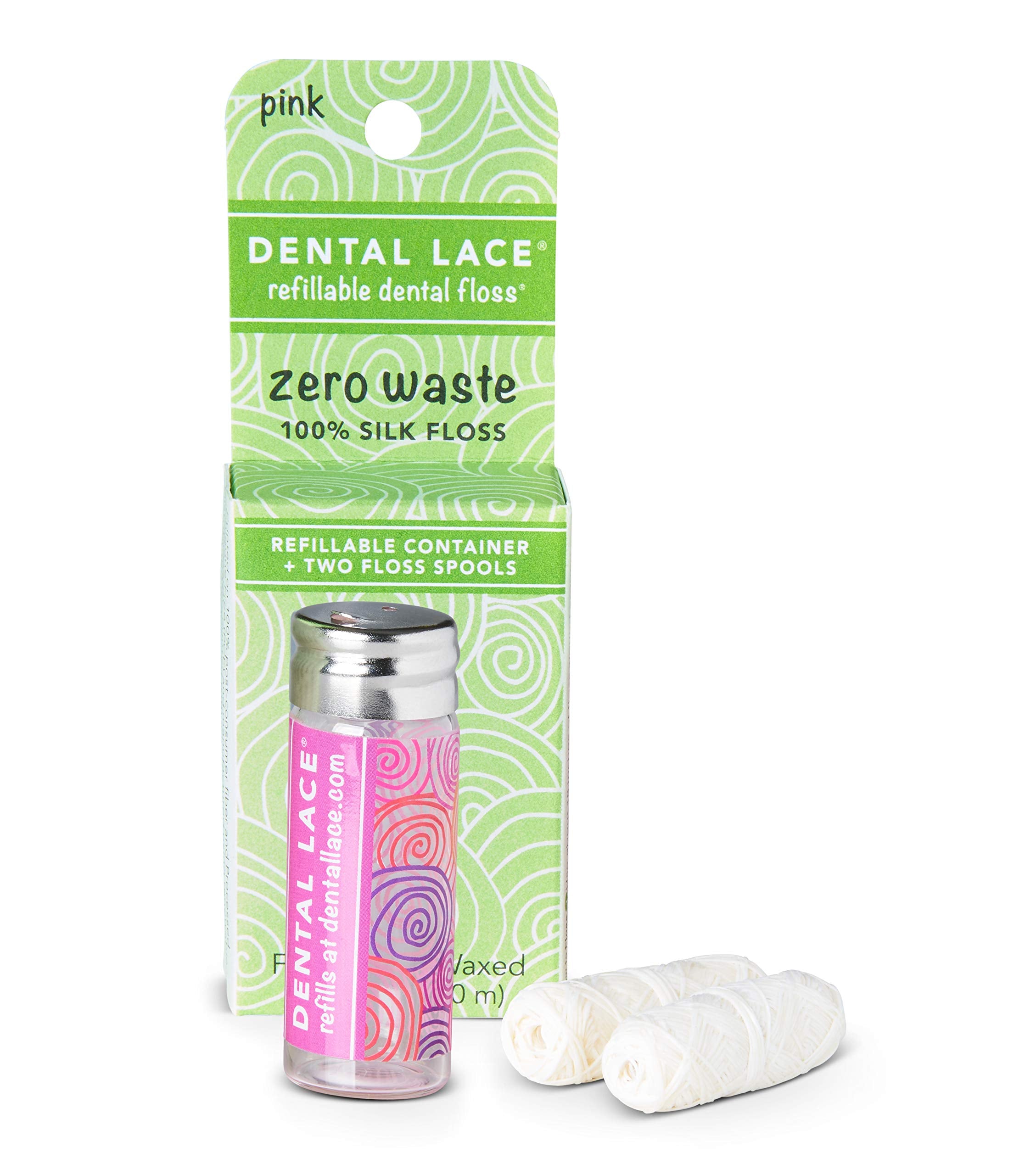 - Includes one fashionable recyclable, refillable container and two spools of floss. USA company based in Maine.