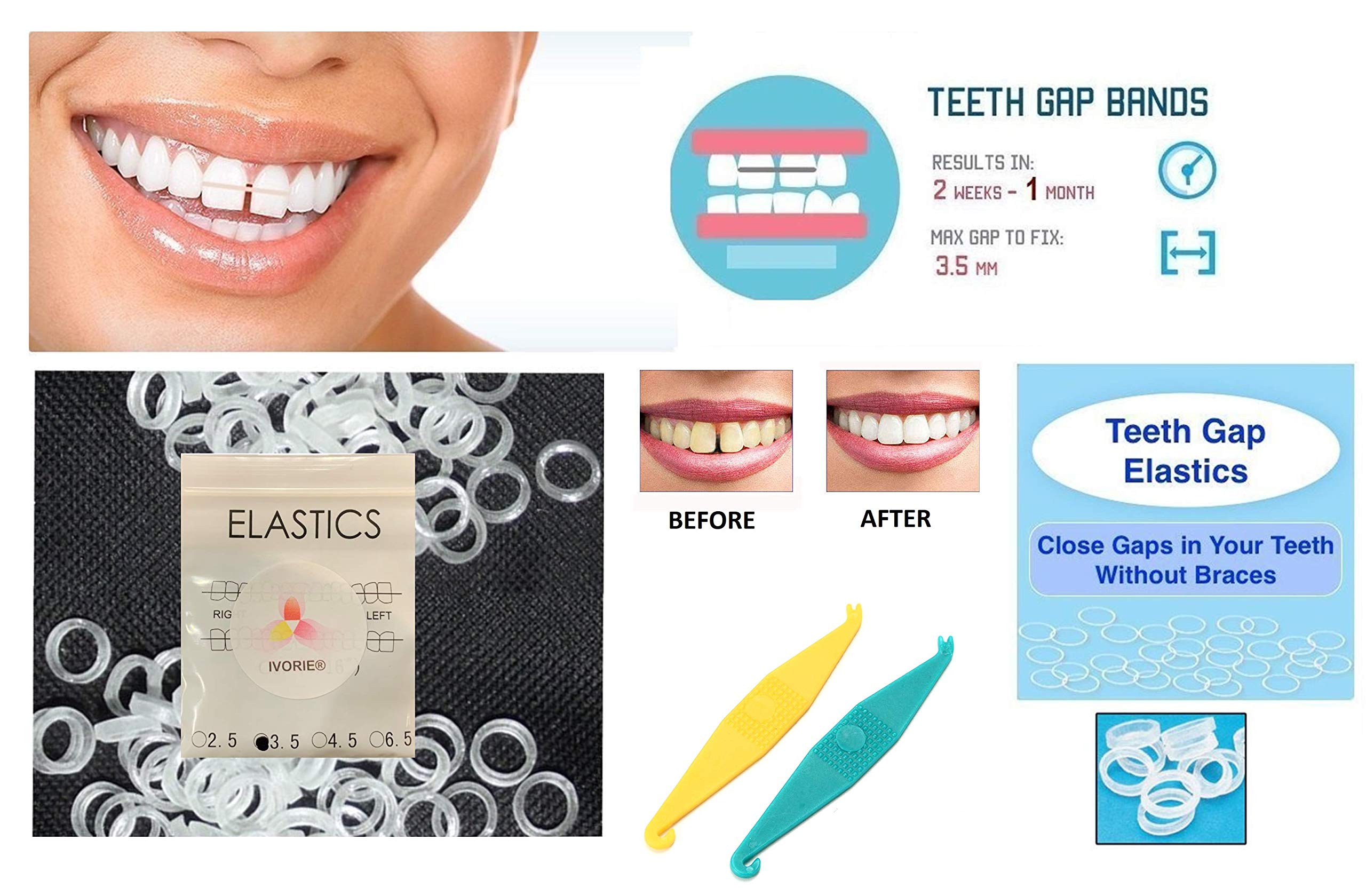 FEATURES: * Clear, non-latex bands so they appear clear on your teeth. * Now you can close those teeth gap permanently without the cost of braces. * The teeth gap bands can fix teeth gaps in as little as 30 days when used properly. * The teeth gap bands are a safe way to permanently close the gap between teeth without any side effects. * The teeth gap bands can only treat teeth gaps smaller than 3.5mm. * To be used on adult teeth only. * These bands can be used for front teeth (both upper and lower). INSTRUCTIONS: * Attach the teeth gap bands to your teeth. Take one band out of the factory sealed package. Grasp each side of the band with the index finger and thumb of each hand and stretch it out. Slowly slide the band around the outside of the teeth which surround the gap you wish to close. Close to the gum line is better, but will need to be changed more often to keep clean. * Initially you may need to use mirror while placing the band around your teeth, however with time you will be able to quickly change your bands with little effort. * For the first few days the teeth the bands are attached to will be sensitive. This is normal and is sign of movement. The same sensitivity is felt by patients using braces. Do not let this sensitivity discourage you. With time, this sensitivity will subside. If needed, take an over the counter pain medication to ease the pain. * Use a new tooth gap band every night. The bands stretch with use and a new band is more effective. * Teeth gap bands should be worn a minimum of 10 hours per day. They should be removed when eating and brushing your teeth. * If you feel too little or too much pressure, you may need a smaller or larger size teeth gap band. * After your gap closes you are advised get retainer or bonding to stop movement or the gap will grow again. This is typical with braces as well.