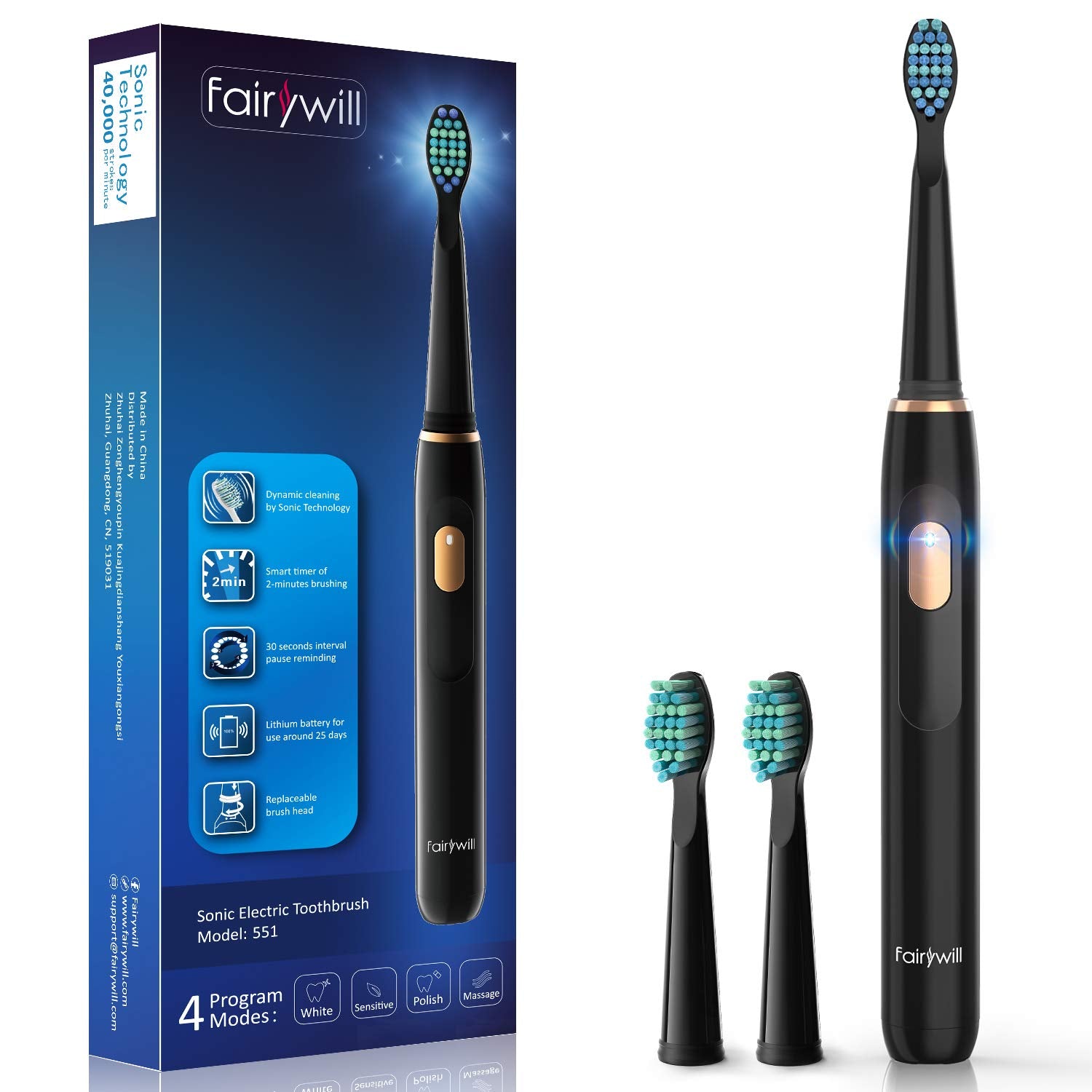 Fairywill Electric Toothbrush Sonic Rechargeable for Adults and Kids, Travel-Friendly Design Whitening in 4 Modes, 40,000VPM Power Toothbrush Fast Charging with Timer, 2 Brush Heads 551 Black Series by Fairywill Store