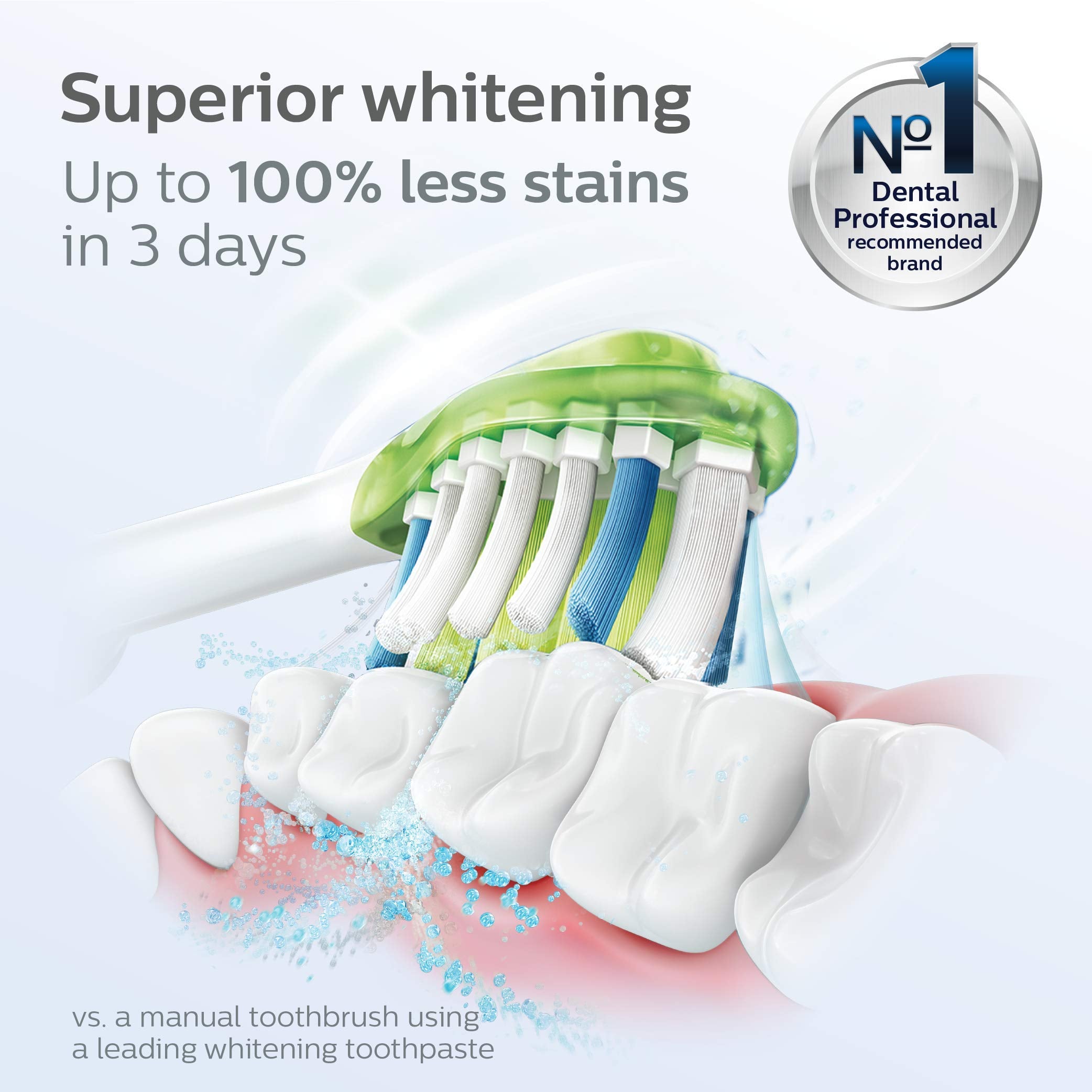 The Philips Sonicare Premium White brush head gives you a whiter, brighter smile. Designed to work with all click-on Sonicare models, these replacement brush heads have polishing bristles that remove surface stains to visibly whiten teeth in just 3 days, while you get an exceptional deep clean. Use with a Philips Sonicare BrushSync(TM) compatible handle (DiamondClean Smart or ProtectiveClean) to unlock Smart features: BrushSync mode-pairing triggers your handle to select optimal mode and intensity level for exceptional plaque removal (certain models only); BrushSync replacement technology tracks how often and how hard you brush and will notify you when it is time to replace your brush head. Also, reminder bristles fade to let you know when it's time for replacement. Replace your brush head every 3 months as recommended by the American Dental Association. A fresh brush head every 3 months maximizes the effectiveness of Philips’ unique Sonicare technology. Essential Oil Warning: Toothpaste containing essential oils can damage your brush head. Avoid direct contact with products that contain essential oils or coconut oil. Use may result in bristle tufts dislodging.