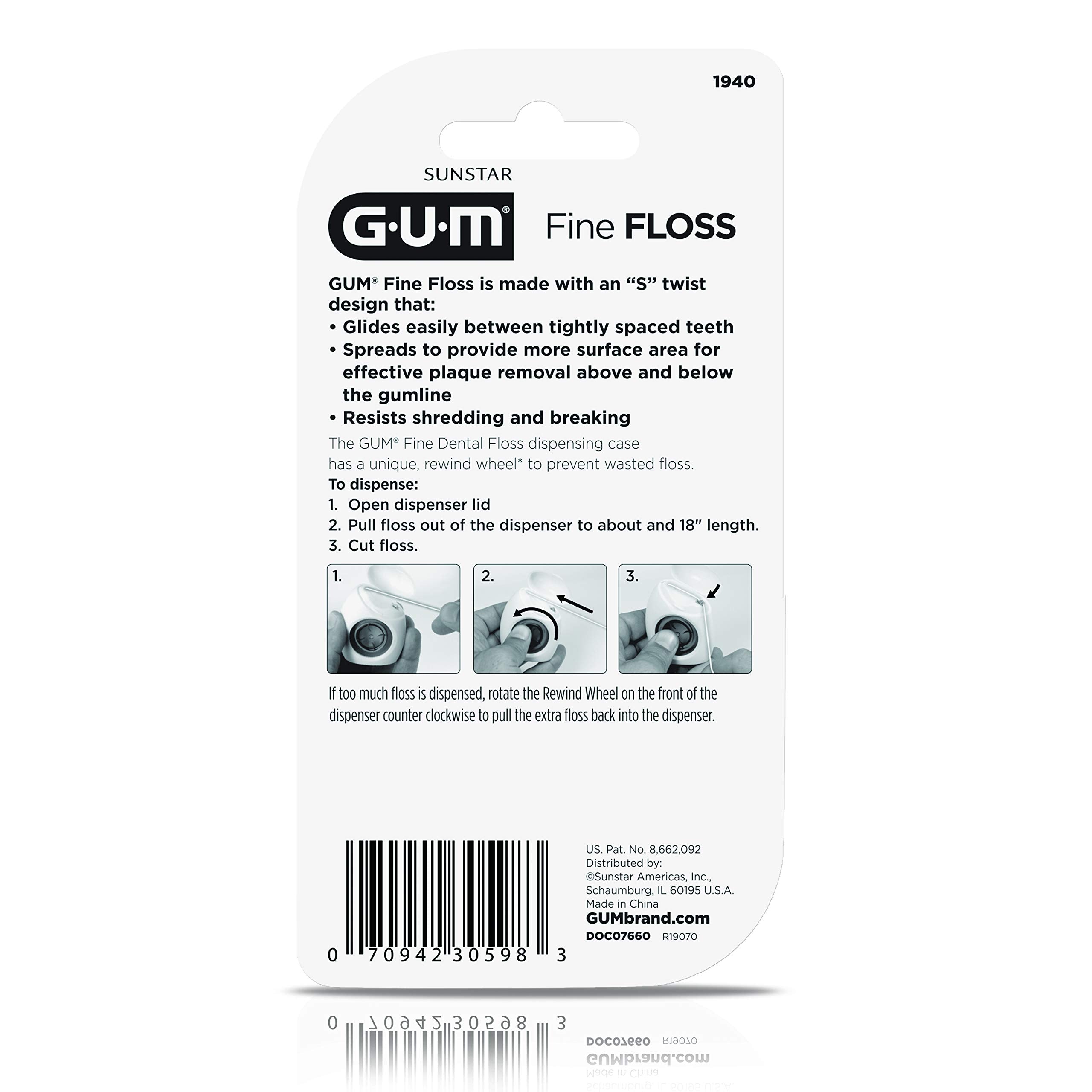 GUM fine floss is designed to remove dental plaque from areas between the teeth most commonly missed by tooth brushing alone. If dental plaque is not removed frequently it can cause inflammation of the gums and lead to gum disease. GUM fine floss is a thin, shred-resistant dental floss that easily slides between tightly spaced teeth and under the gum line. Special 'S' twist fibers give durability and spread ability to disrupt plaque deposits and carry them away. Between-teeth cleaning is recommended by dentists and dental hygienists to remove the dental plaque that toothbrushes alone cannot reach between the teeth.