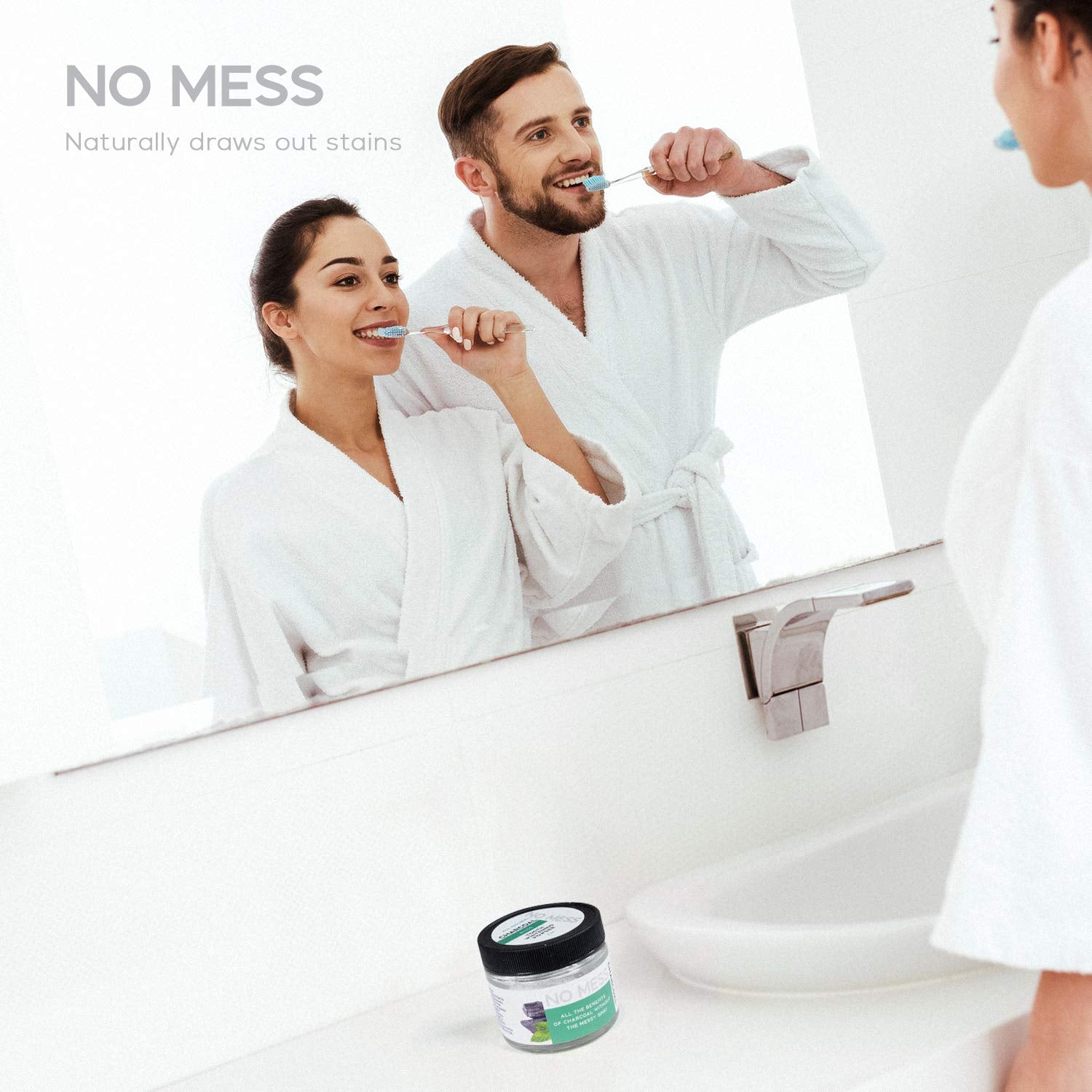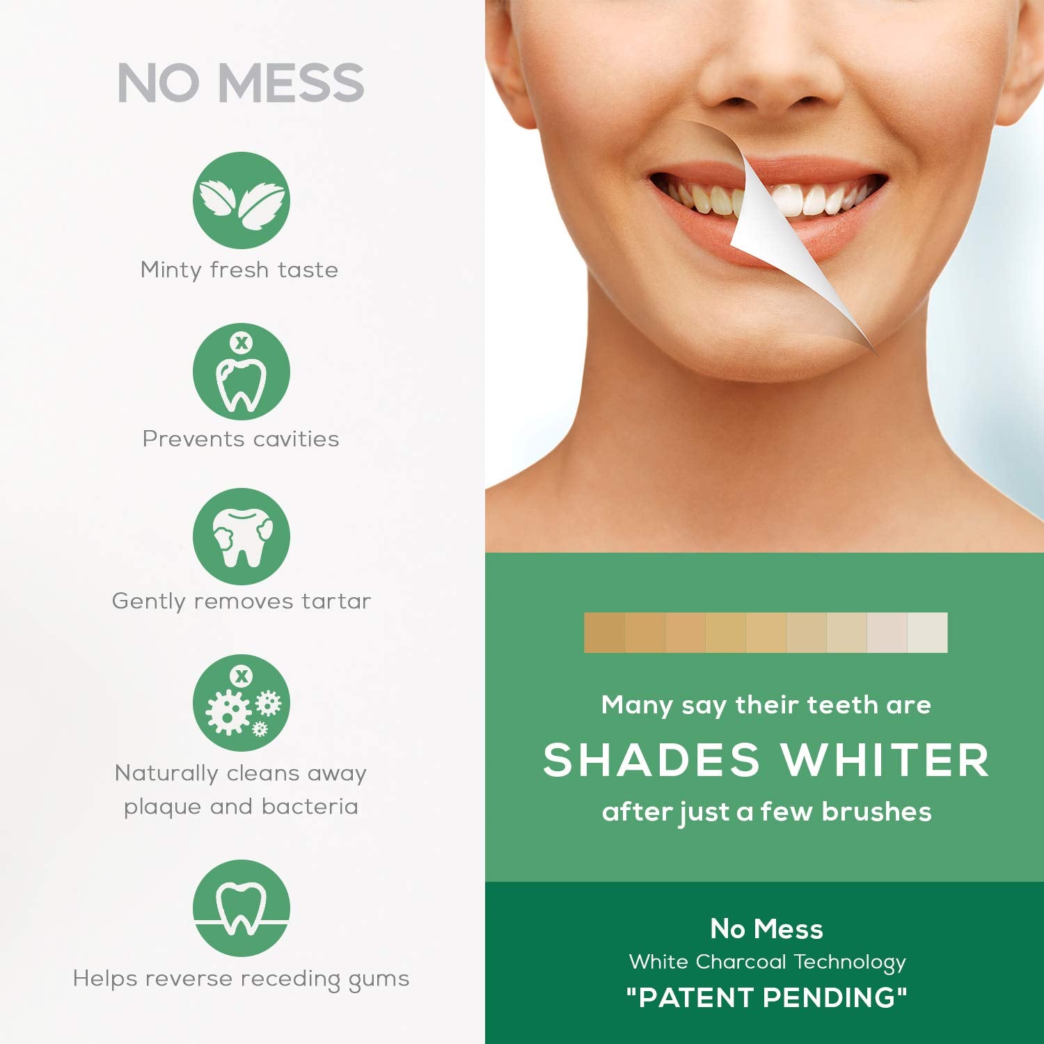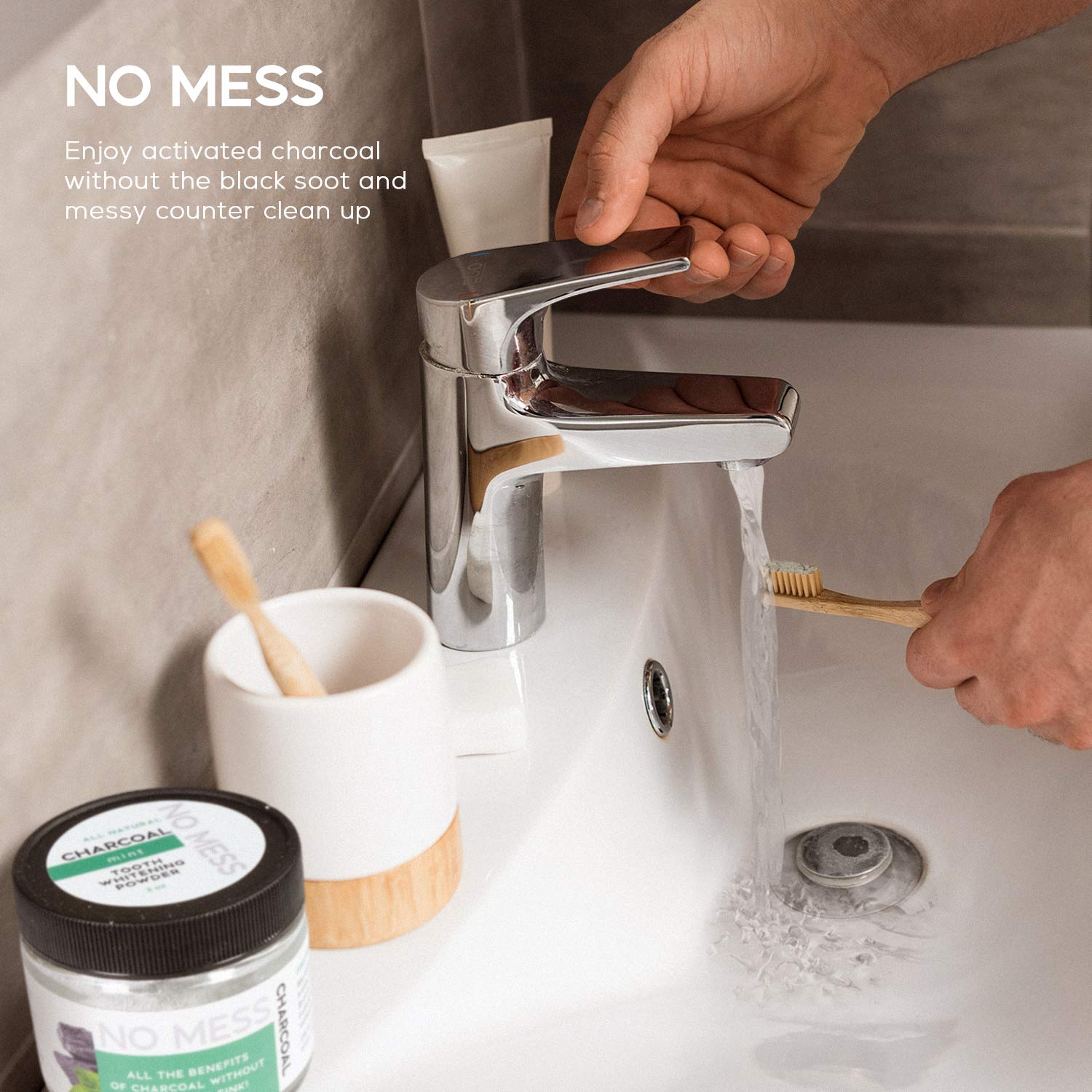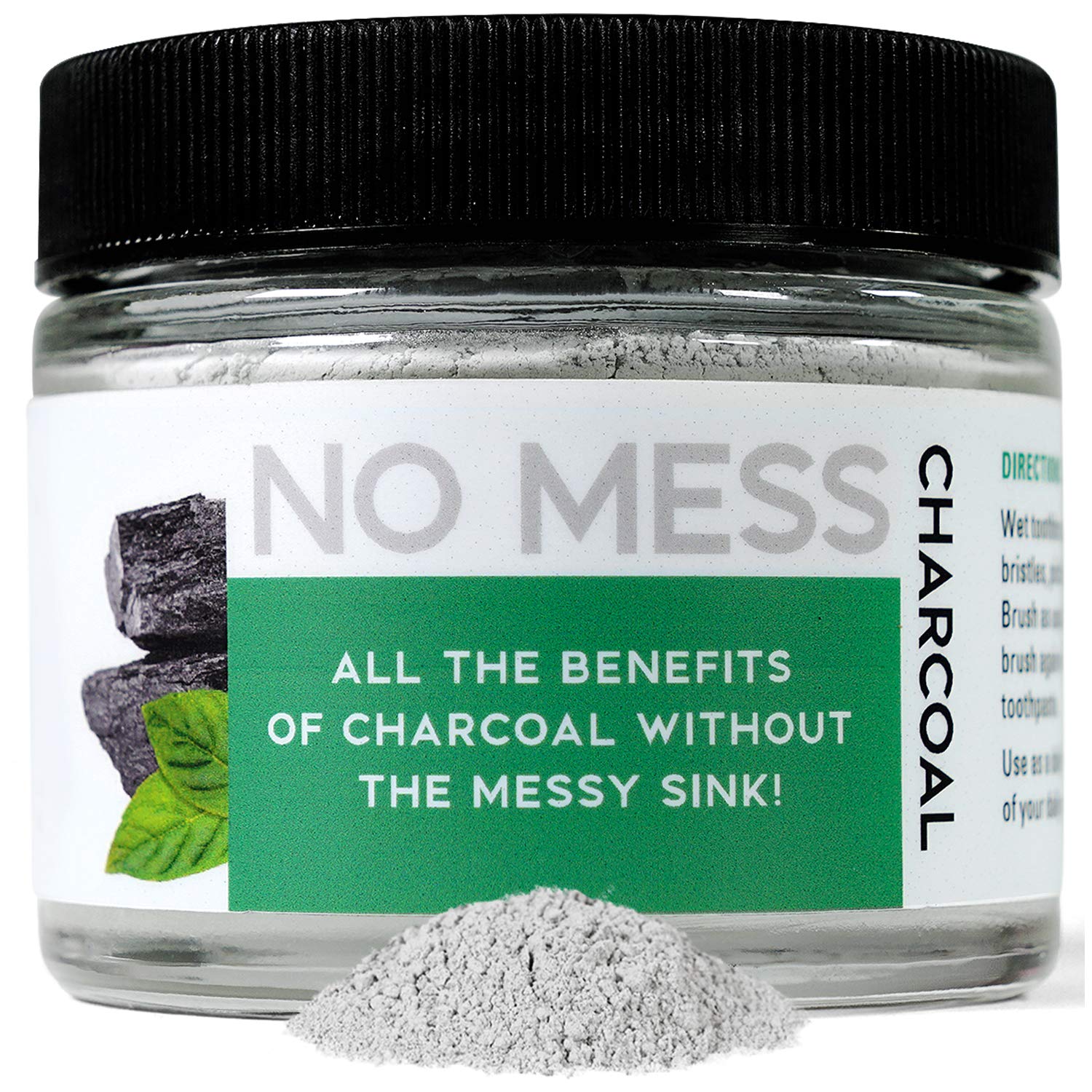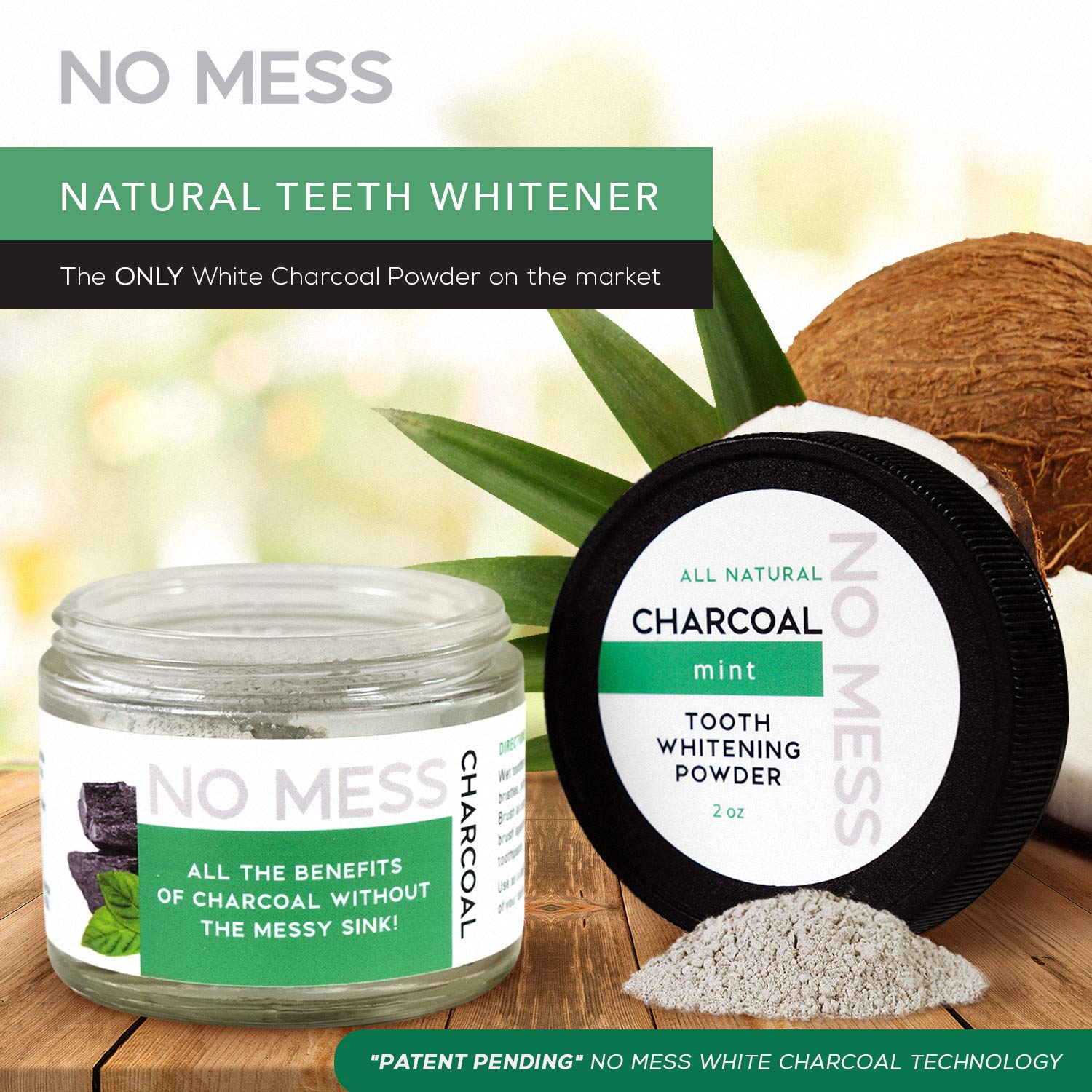 - No More Black Teeth: NO MESS is the ONLY white activated charcoal toothpowder on the market - You’ll enjoy all the health benefits of brushing with activated charcoal, but without the embarrassing black charcoal lines between your teeth and gums that require 2 to 3 ‘re-brushings’ (plus extra flossing) just to clean away