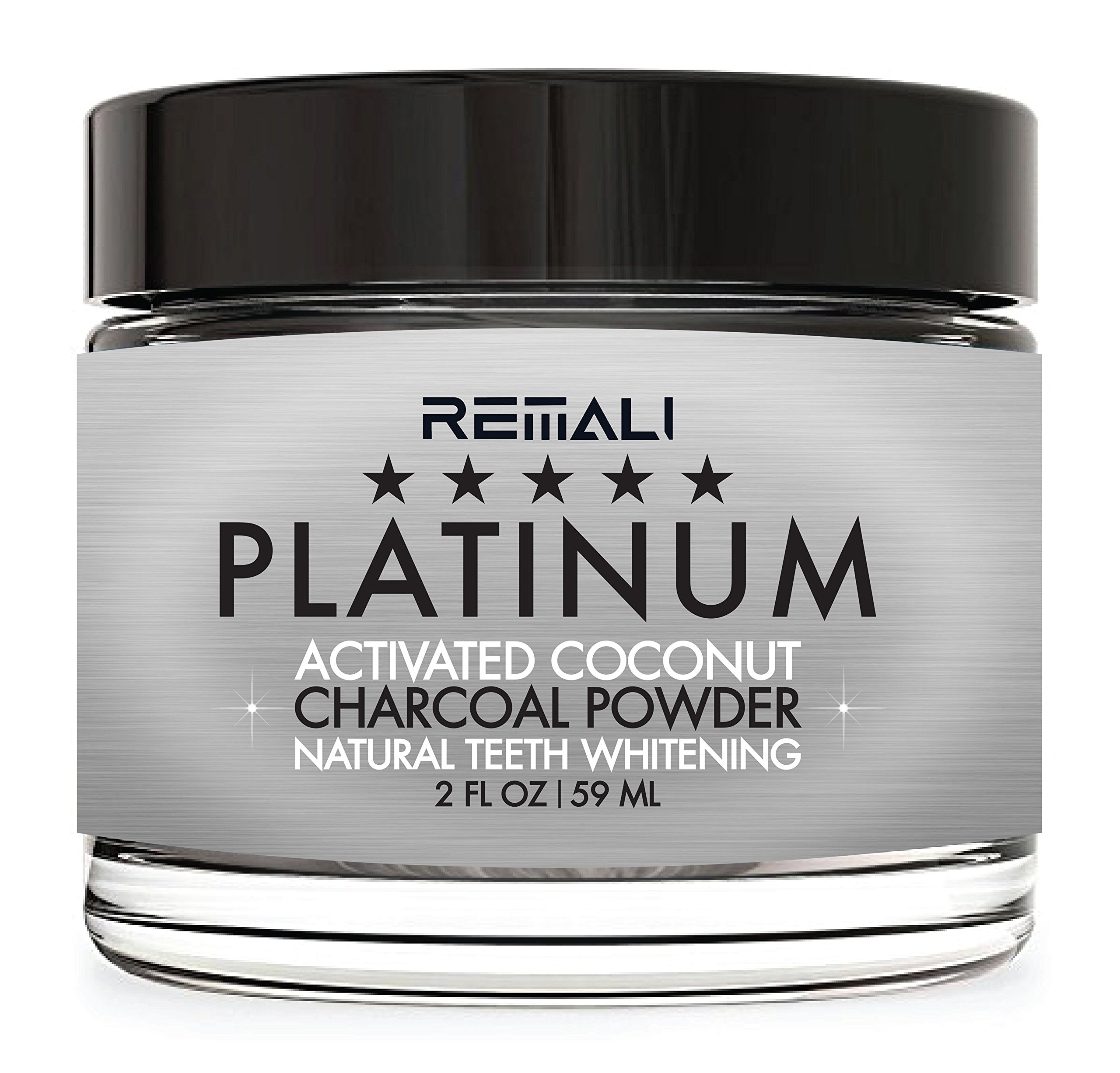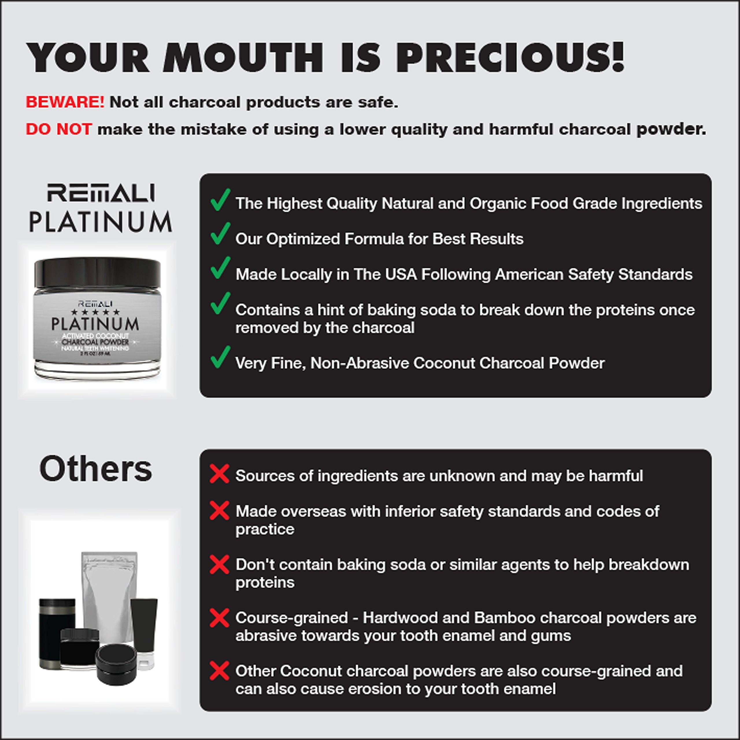 REMALI PLATINUM Activated Charcoal Teeth Whitening Powder - MADE IN USA from all NATURAL and ORGANIC Coconut – NON ABRASIVE Formula Proven SAFE for Enamel– Better Stain Remover than Strips,Kit,Gel,Pen