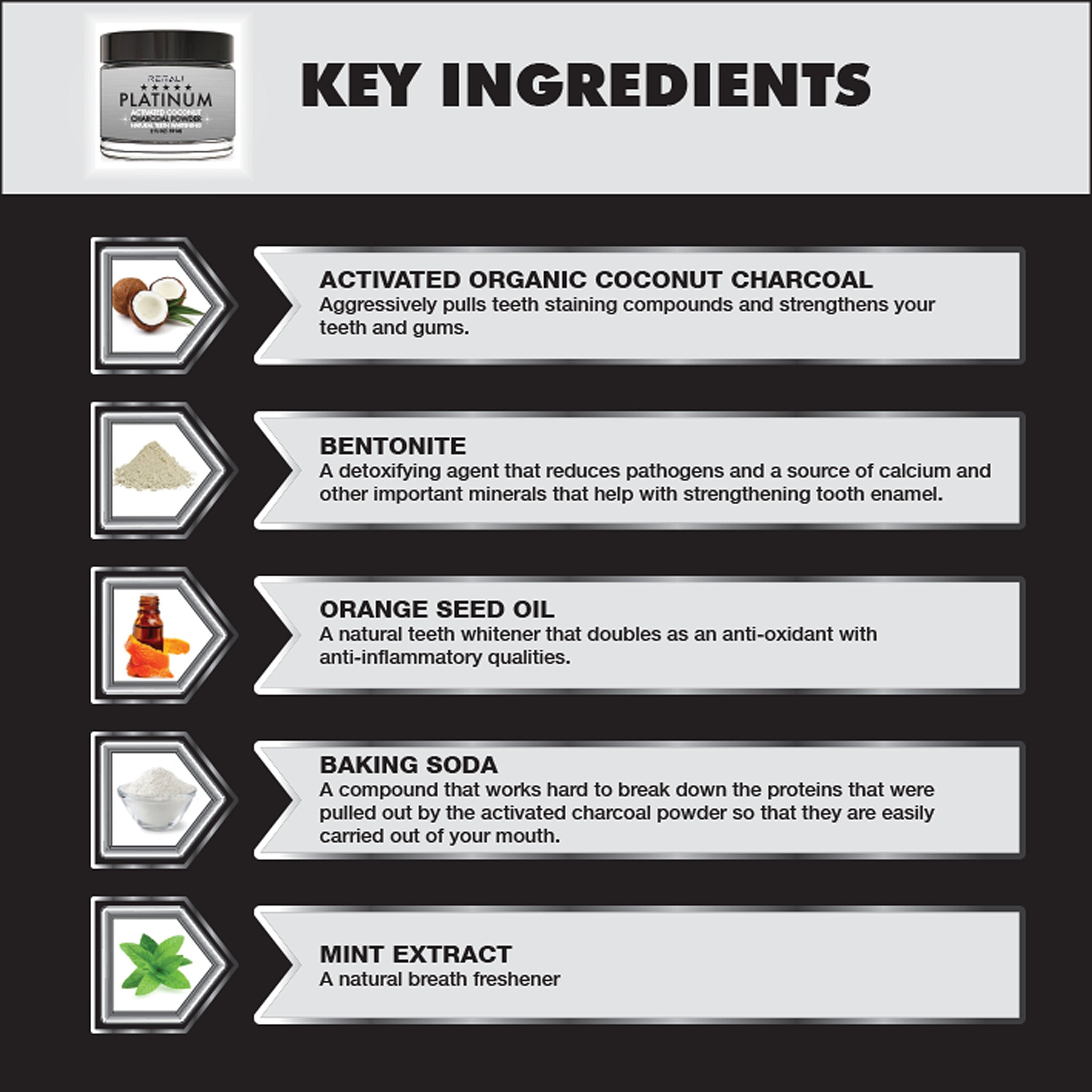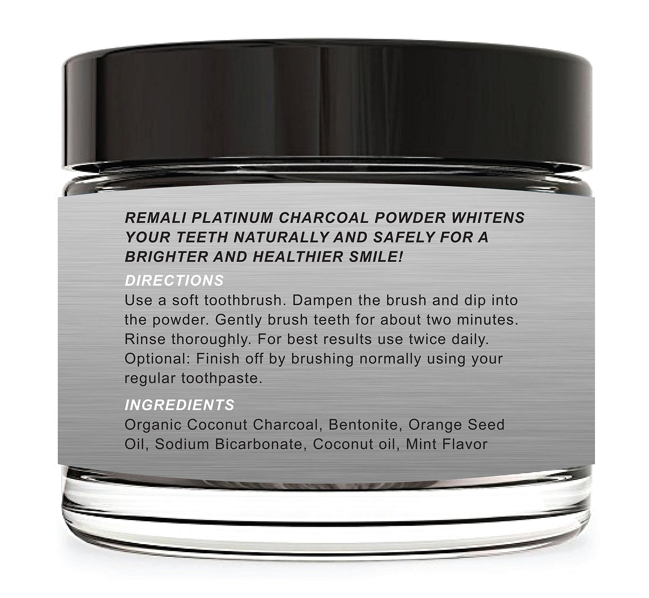 - ONLY THE HIGHEST QUALITY INGREDIENTS USED – The ingredients used in our REMALI PLATINUM activated charcoal teeth whitening powder are Organic, Natural, Gluten Free and Vegan. It does not contain any fluoride, hydrogen peroxide, surfactants, GMOs, chemicals or bleach. Gently brush your teeth with our activated charcoal powder once or twice daily. For best results use with our Remali Platinum Soft Toothbrushes.