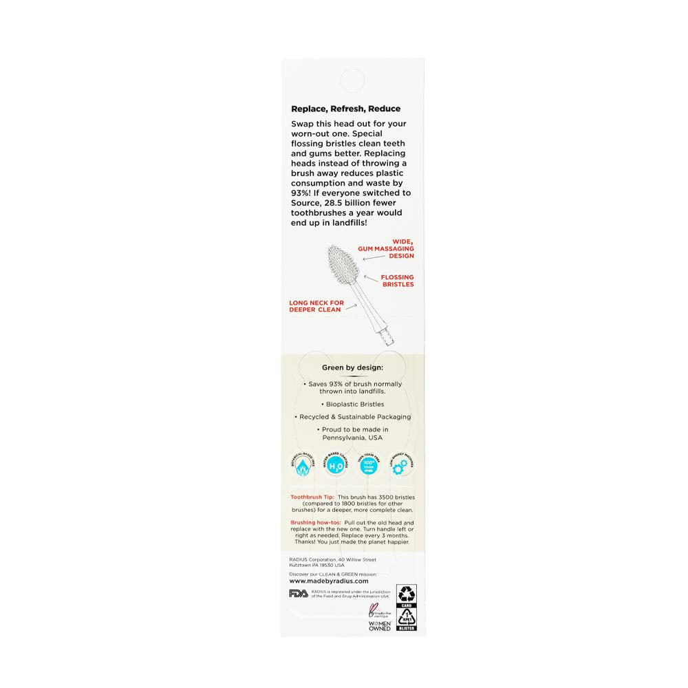 - FOR SOURCE AND TOUR TOOTHBRUSHES: RADIUS Replacement Heads boast our signature bed of super-soft, fanned bristles in a swappable pair.