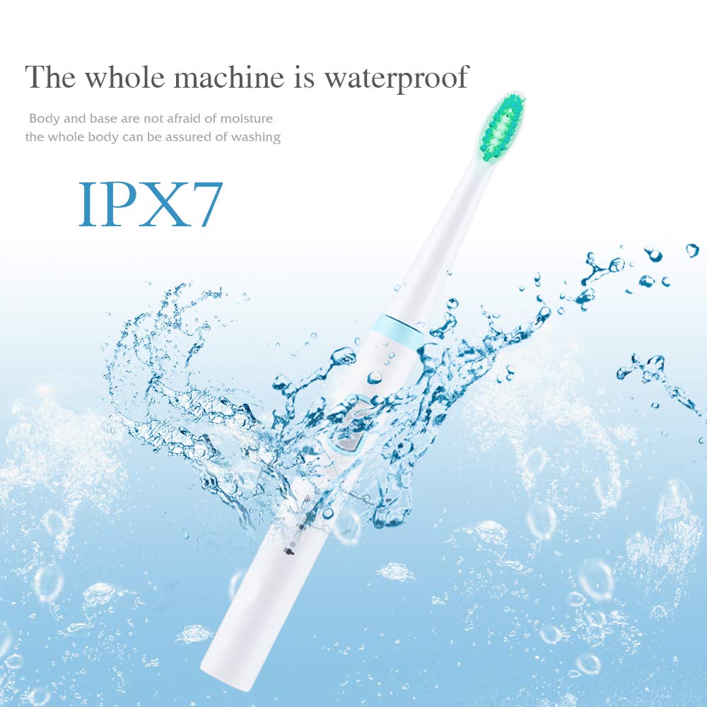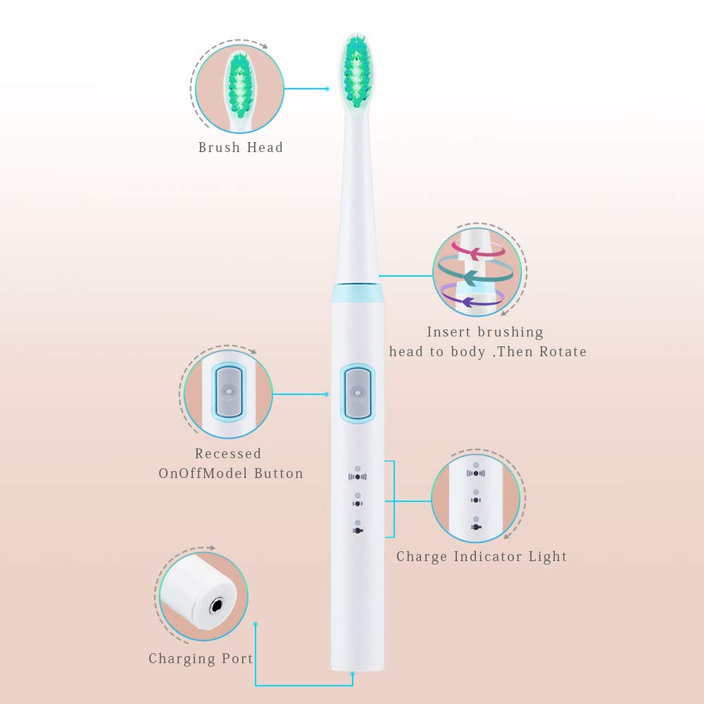 **Seller Tips 1:Attach the bristle with toothpaste on the teeth before turning on the brush to avoid splashing paste. 2:The best cleaning performance is achieved when you can clearly feel the micro brush movements on your teeth. 3:Dentists suggest 2 minutes toothbrush time and replace toothbrush head at least every 3 months. 4: IPX7 waterproof sonic electric toothbrush allows it to be used during shower or bath, and is 100% washable. 5.Soft Brush Heads with durable Nylon bristles, safely deep into the gum gap and flexible to clean oral blind area, taking care of your gums gently, very friendly to sensitive teeth. **What's in the box: 1 Sonic Electric Toothbrush 2 Replaceable Electric Toothbrush Heads 1Travel Case Toothbrush Box 1 USB Cable without Adapter 1 Instruction Manual ****