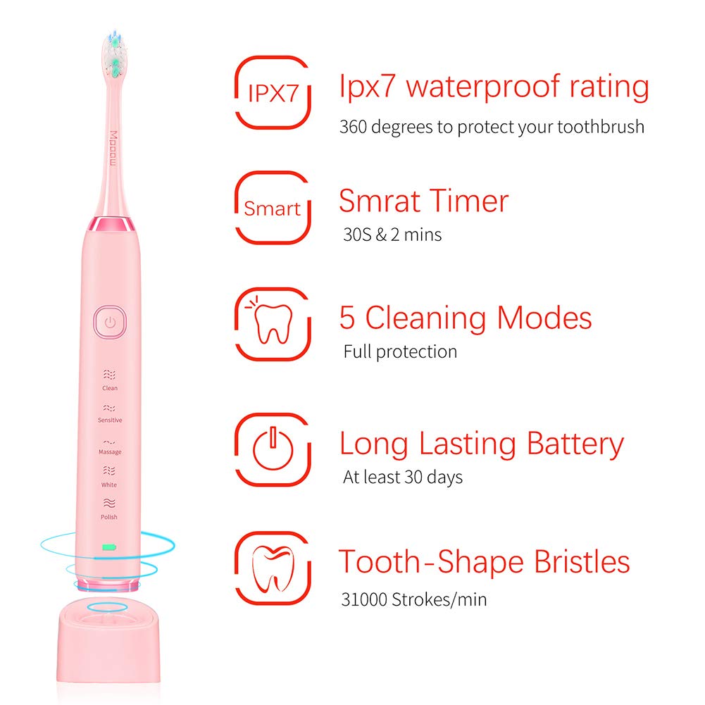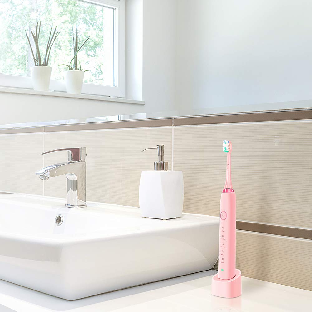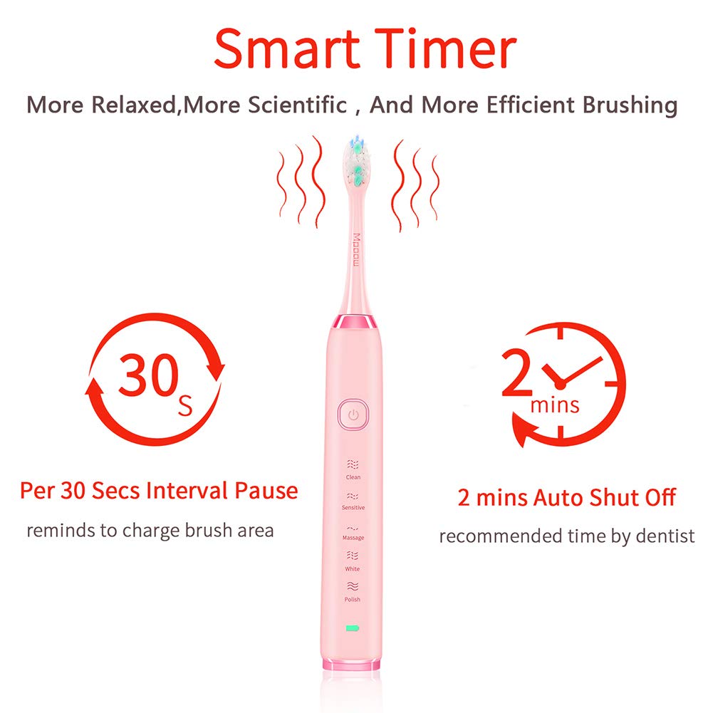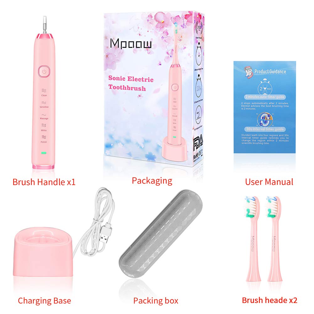 **5 modes to choose from** Clean: daily cleaning, effectively lighten plaque Senstive: suitable for people with sensitive or filling teeth Massage: weaker frequency stimulates and massages gums for comfort White: removes stains and makes teeth whiter Polish: polishing the front teeth to make the teeth shine **Electric toothbrush** 31,000 beats per minute Excessive frequency vibration will wear the teeth Too low frequency vibration can not effectively remove tooth stains The best sonic frequency recommended by an authoritative dentist **Polish mode** Innovative polishing mode, which produces sound waves that clean the teeth and brighten your teeth **Nursing timing mode** Our electric toothbrush has an internal 2-minute smart timer that alerts every 30 seconds. In order to prompt replacement to clean another area. This electric toothbrush helps to develop brushing habits and ensures that each area is well cleaned. **Package list:** 1* Toothbrush 2* Toothbrush heads 2* Bristle covers 1* Charging base 1* Travel box 1* User manual