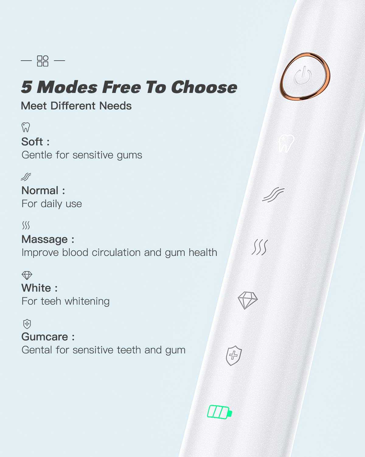 - 【EASY TO USE WITH 5 MODES & SMART TIMER】:Our travel electric toothbrush easy to use with the mode memory function and smart reminder.5 modes to choose: soft, normal, massage, white, gumcare. meet various oral needs, deep clean the tooth surface . Long-term use can effectively achieve teeth whitening.Built-in 2 minute smart timer with interval pause reminding each 30 seconds.Give you the perfect experience.