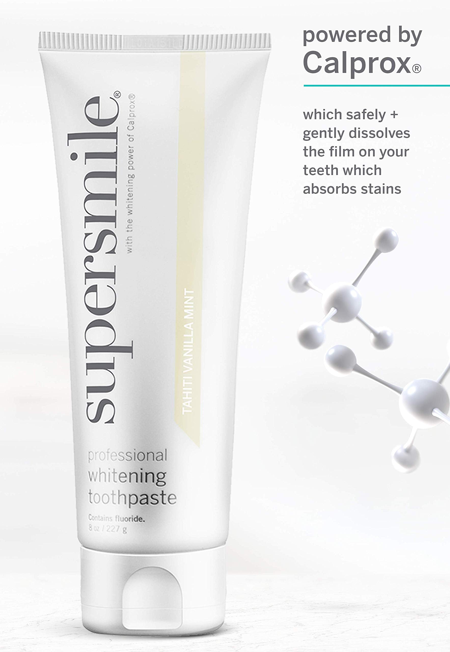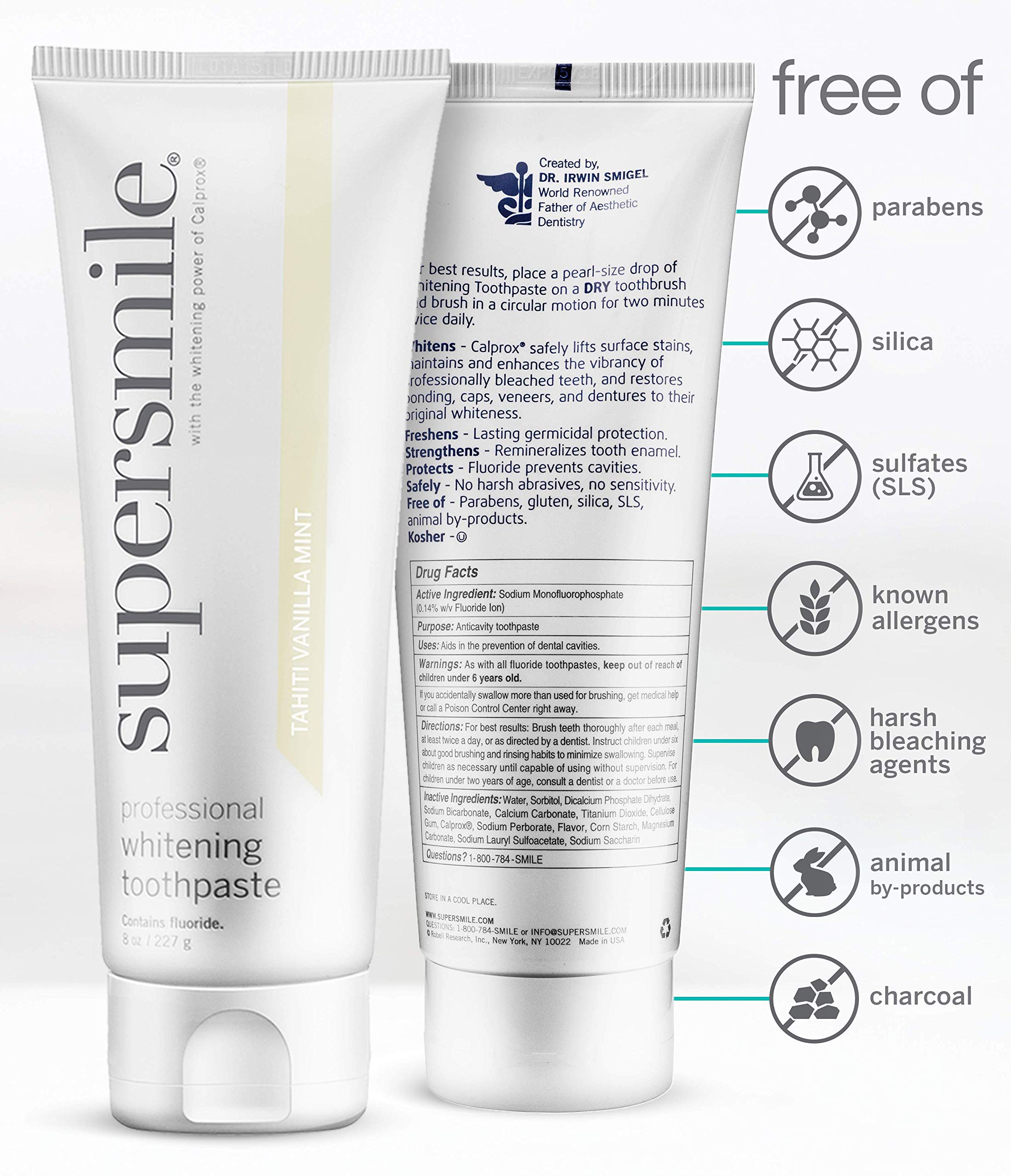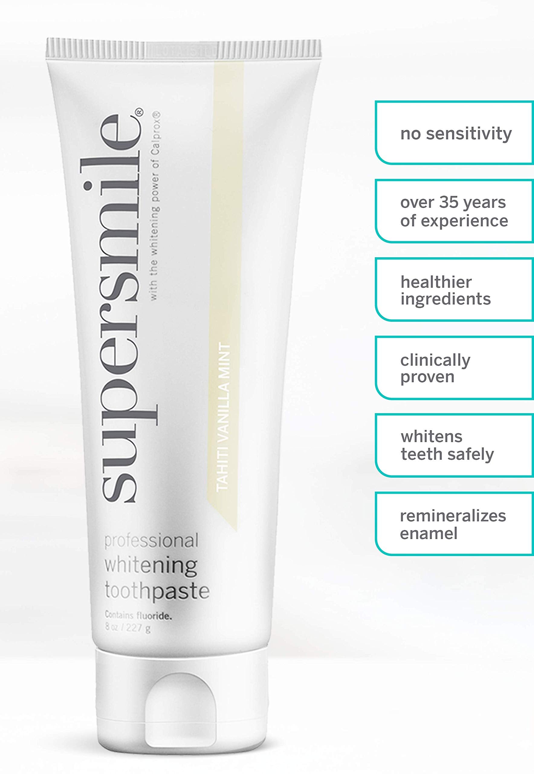 Color: **Tahiti Vanilla**### Product DescriptionGet the brilliant smile you've always dreamed of with Supersmile's Professional Whitening Toothpaste. Developed by Dr. Irwin Smigel, world- renowned "Father of Aesthetic Dentistry", Supersmile is the number one teeth whitening brand recommended by cosmetic dentists. Designed to whiten teeth and improve oral health with every...