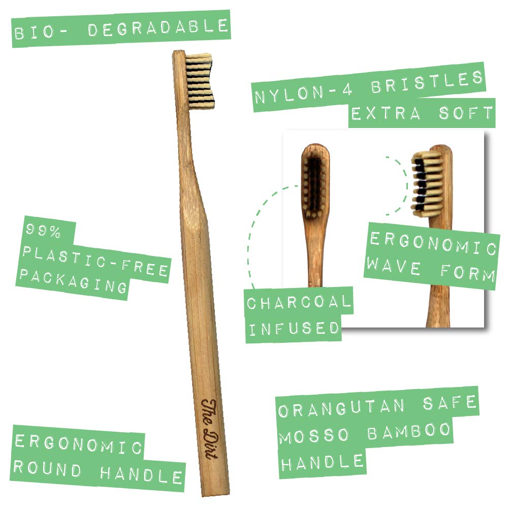 - SOFT BRISTLE: The Dirt toothbrush bristles are made from high-quality bio-nylon-4, and infused with charcoal to help get that deep down grime out from between your pearly whites. The bristles are extra soft, working hard to remove plaque without damaging gums or scraping away your enamel