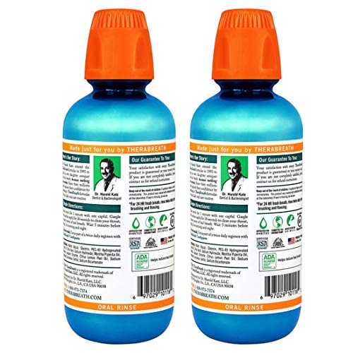 Details: Praised for its ability to attack and eliminate embarrassing breath odor, the patented TheraBreath formula in Fresh Breath Oral Rinse uses the power of oxygen to target bad-breath-causing bacteria deep below the surface of the tongue and at the back of the throat. This refreshing, alcohol-free antibacterial cleanser rinse doesn't burn or sting, so it’s easy to use every day. TheraBreath Icy Mint Oral Rinse is certified kosher, gluten-free and vegan. It is also free of dyes, perfumes, detergents, and other harsh additives that can dry or damage the mouth. TheraBreath Fresh Breath Oral Rinse is our flagship product and has been dentist- and pharmacist-recommended for more than 20 years. TheraBreath Fresh Breath Oral Rinse is an ADA approved product and has become one of the United States' best-selling speciality oral hygiene treatments. Fresh Breath Oral Rinse by Dr. Katz attacks sulfur-producing bacteria, morning breath, and food odor. In fact, clinical studies have verified that TheraBreath is extremely effective at attacking bad breath odor for up to 24 hours. This powerful mouthwash eliminates even the most severe cases of bad breath or halitosis (which is the scientific name for this condition). Dr. Katz’s proven oral rinse formula does not contain alcohol, artificial flavors, or colors. It is also pH-balanced to maintain a non-acidic environment in the mouth, which reduces burning and enamel erosion, while preventing tooth sensitivity. This product is safe to use twice daily and is available without a prescription. This product is sold as a pack of two 16-ounce bottles and is also available in a Mild Mint flavor that is easy on sensitive teeth and gums. As with all our products, TheraBreath Fresh Breath Oral Rinse is guaranteed to work to your satisfaction, or your money back!