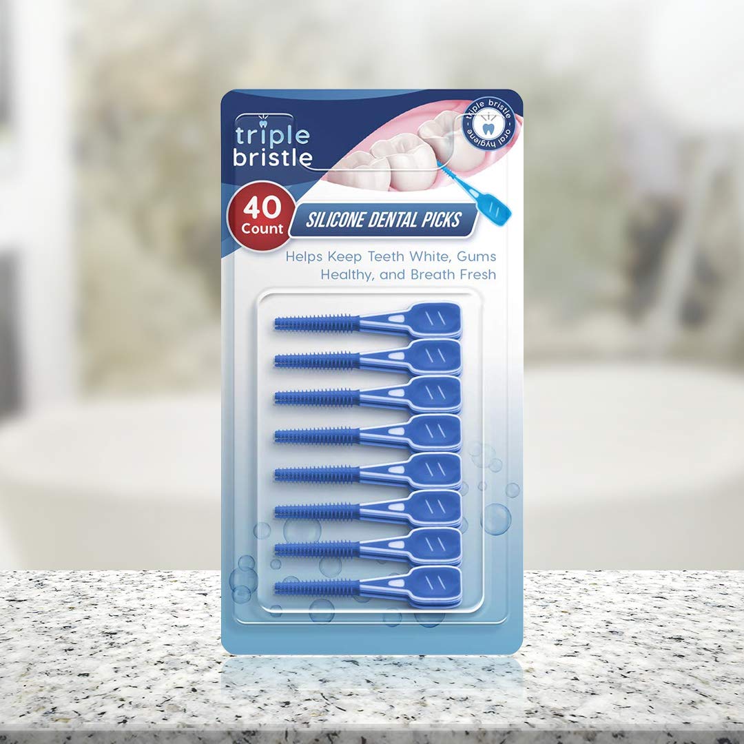 Triple Bristle Silicone Dental Picks are innovative, comfortable, and easy-to- use between-teeth cleaners for the on-the-go removal of dental plaque and food particles from between the teeth and around crowns, bridges, implants, dentures, and orthodontic appliances. **Want to use floss to keep your teeth clean after meals, but it's just too difficult to get between tight teeth?** After enjoying your favorite meal, there's nothing worse on your dental health than food and plaque sticking to tight teeth or hiding out in the back of your mouth. Triple Bristle silicone picks comfort grip handle and non-slip surface for better control, angled head easily reach all corners of teeth cleans between tight spaces while protecting sensitive gums. Food and plaque can stain and even damage your teeth, and you may end up paying for build up at your next dental checkup. Maintain oral hygiene and prevent tooth from decay. Your teeth may feel smooth after using a toothbrush, but inter-dental food and plaque can't be removed without flossing after every meal. Make cleaning tight teeth effortless with Triple Bristle Silicone Picks.