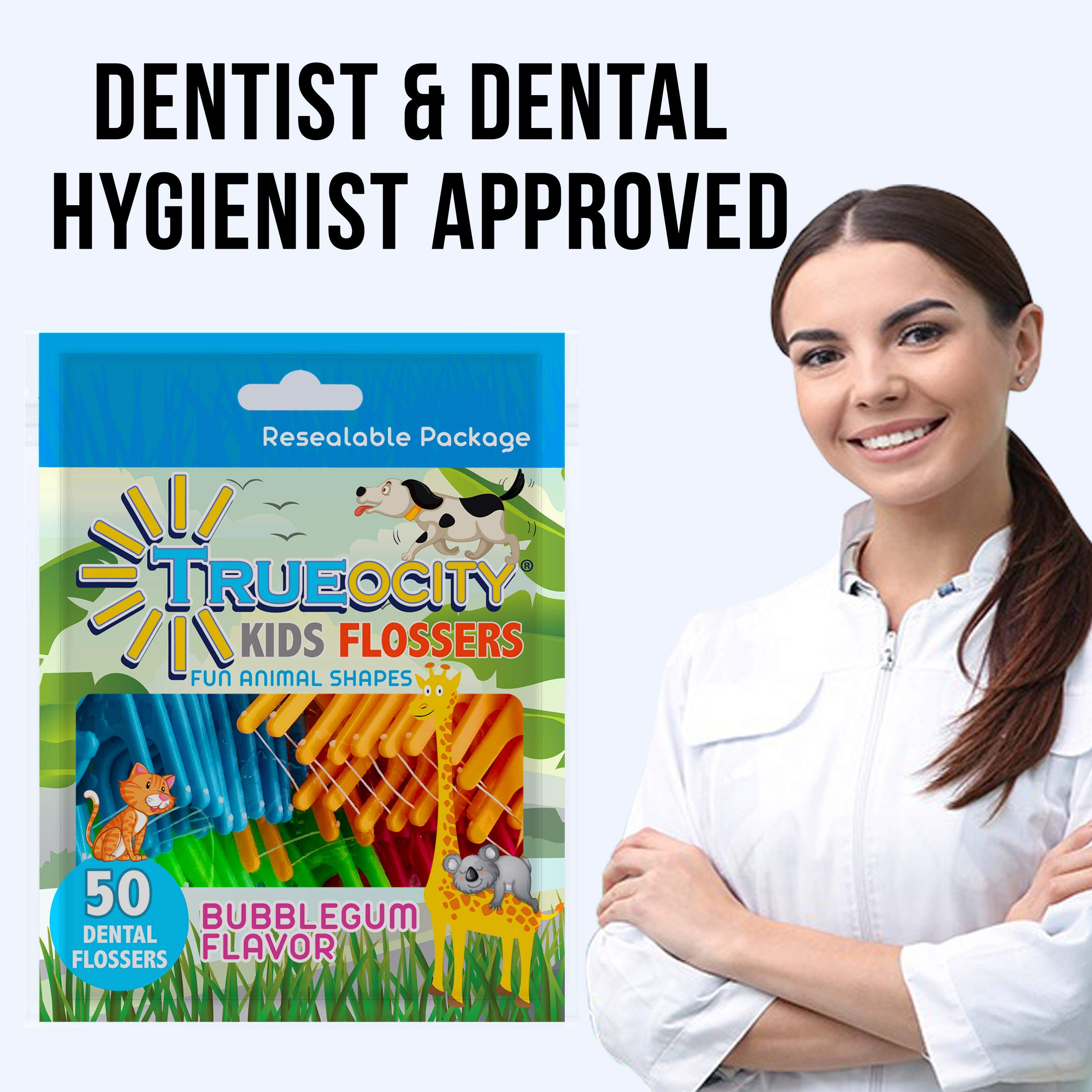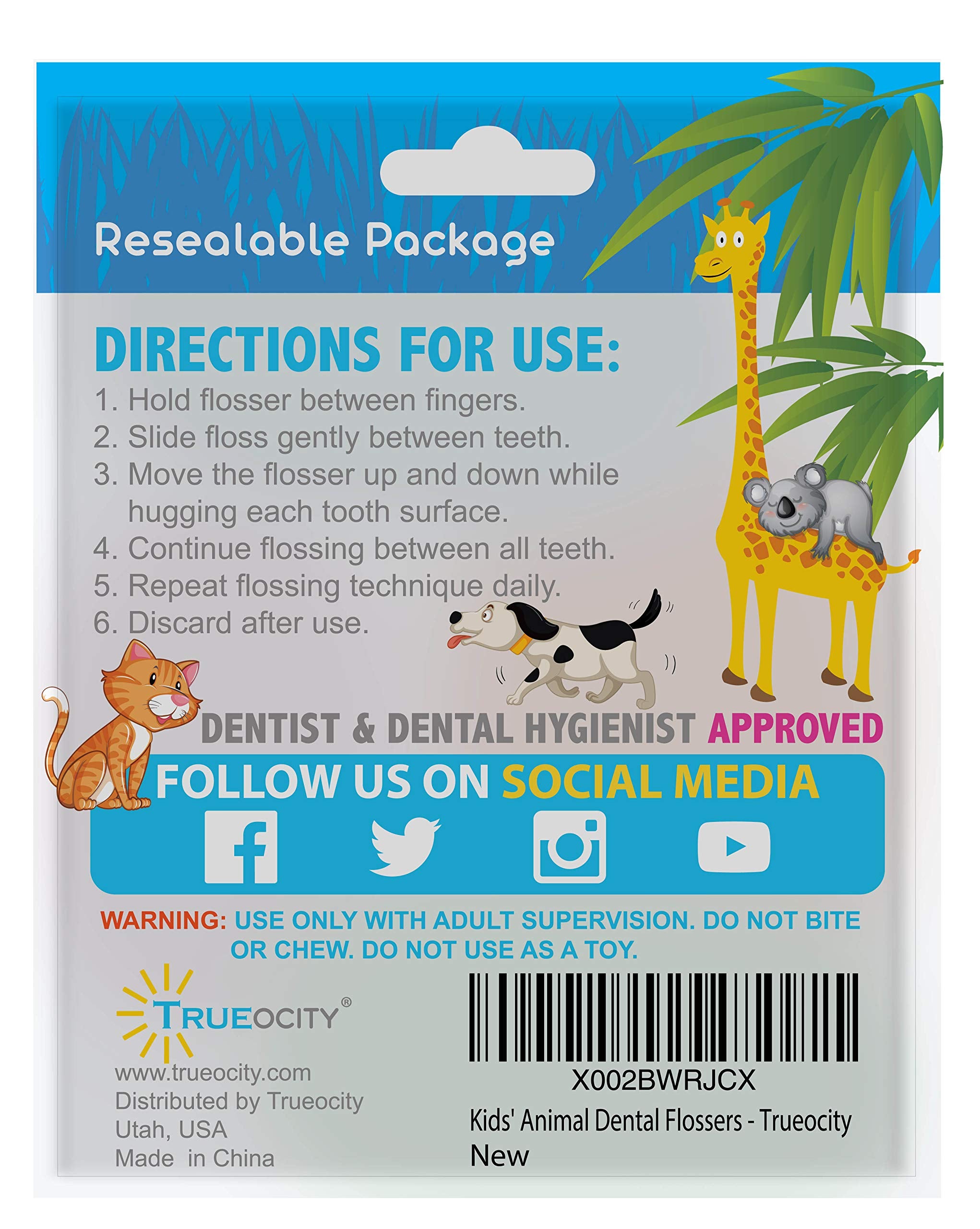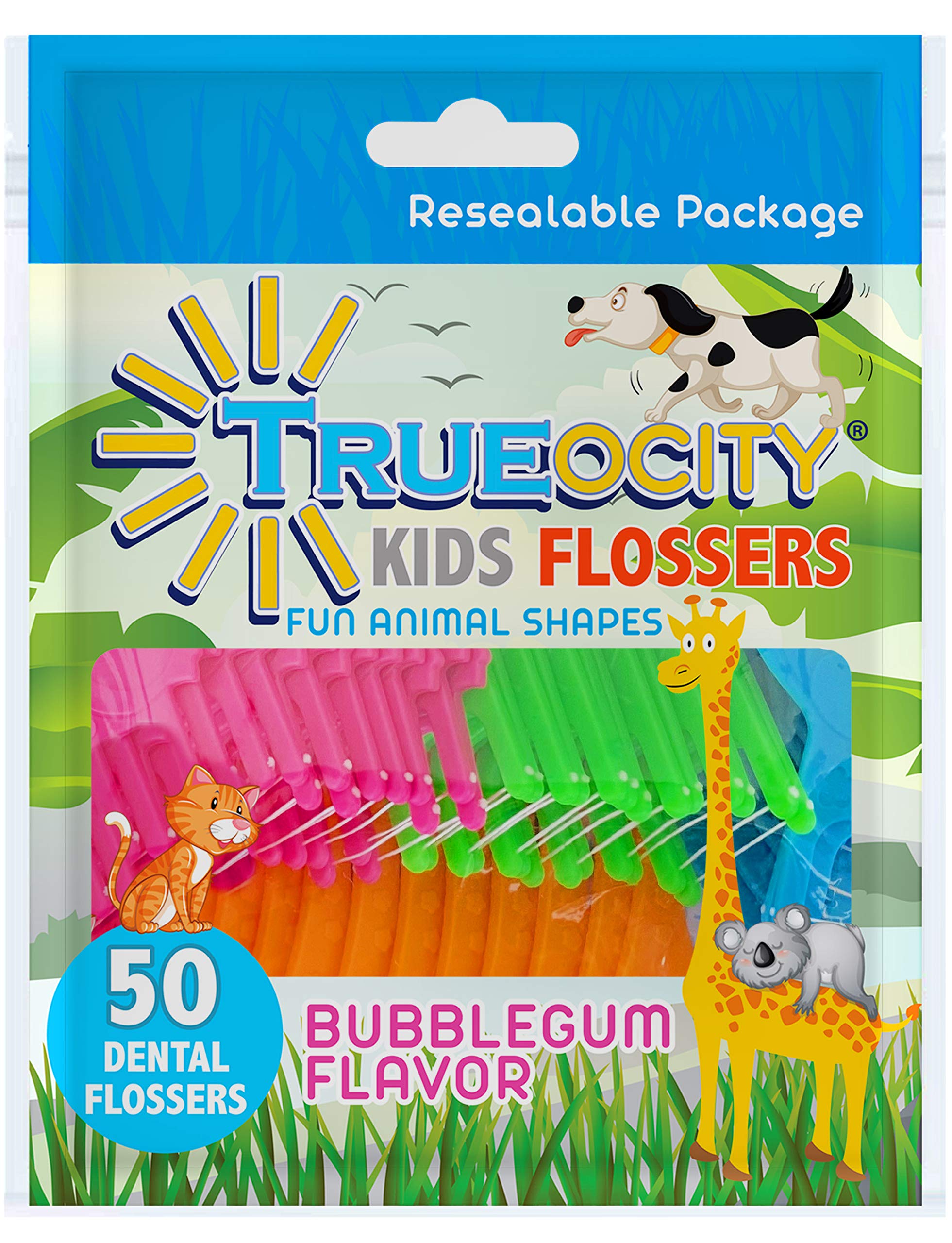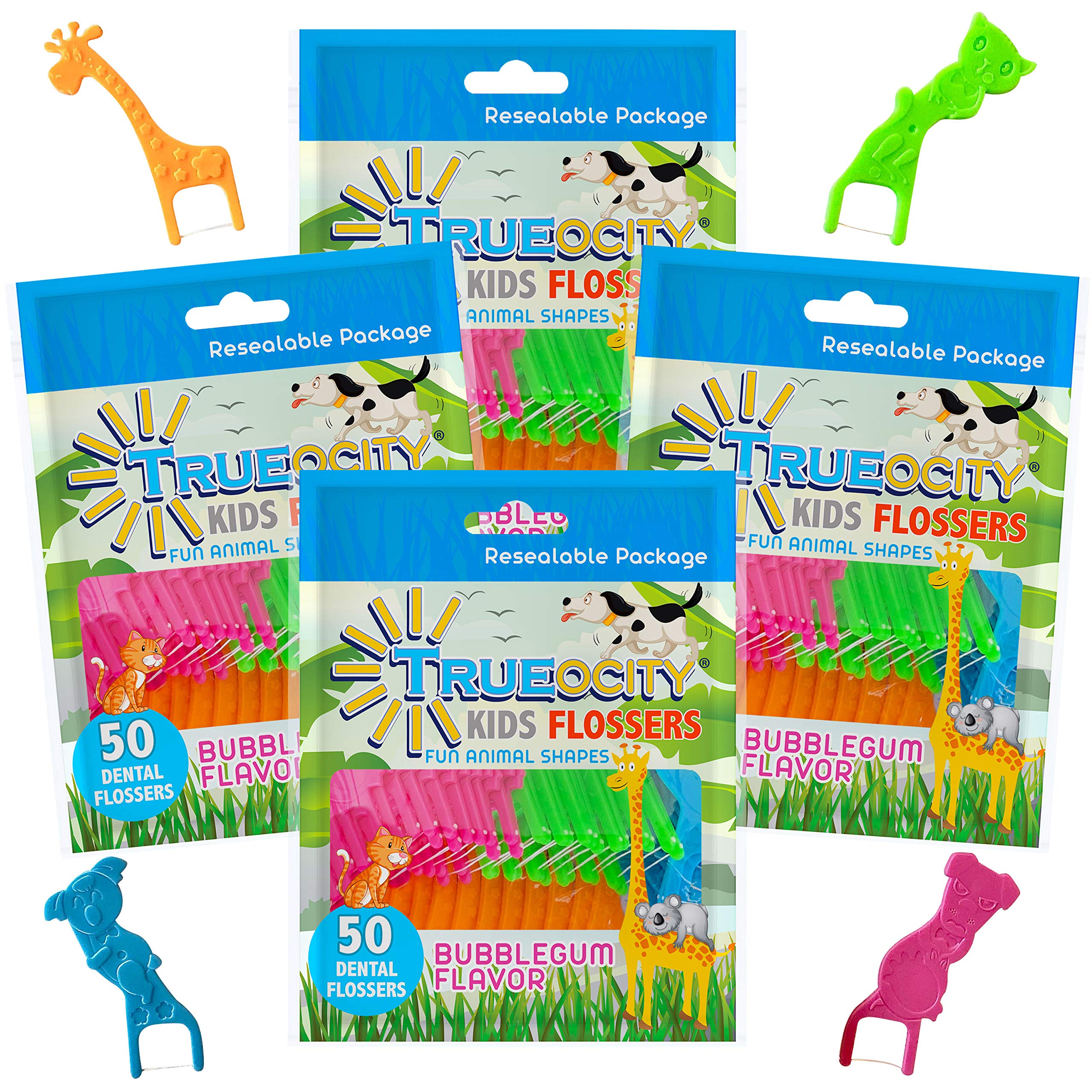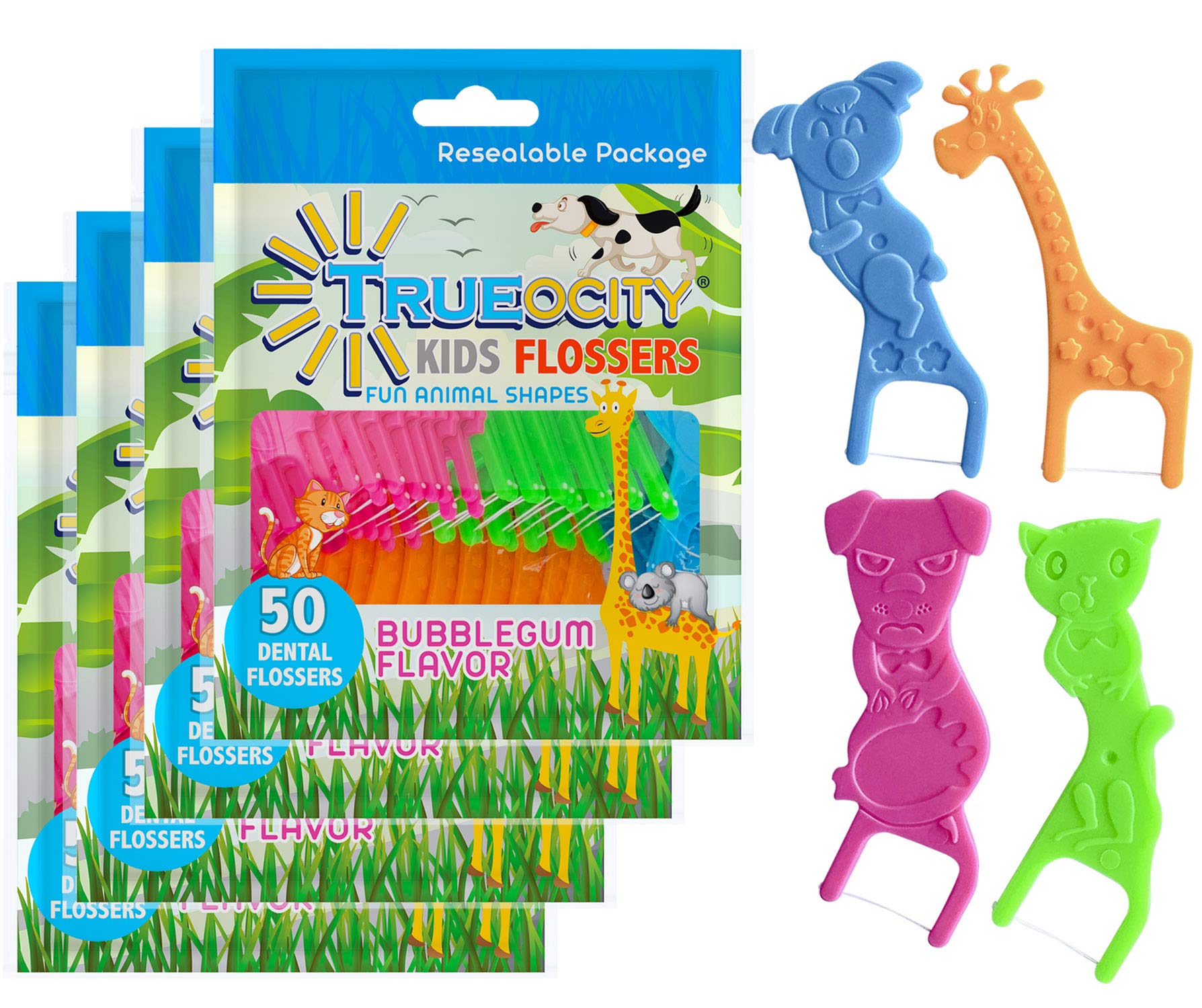 Trueocity Kids Dental Flossers 4 Pack (200 Total), Cute Animal Shapes Makes Flossing Fun, Dental Floss Glides Easy Between Teeth, Flosser Helps Prevent Tooth Decay & Gum Disease, Bubble Gum Flavored by Trueocity Store
