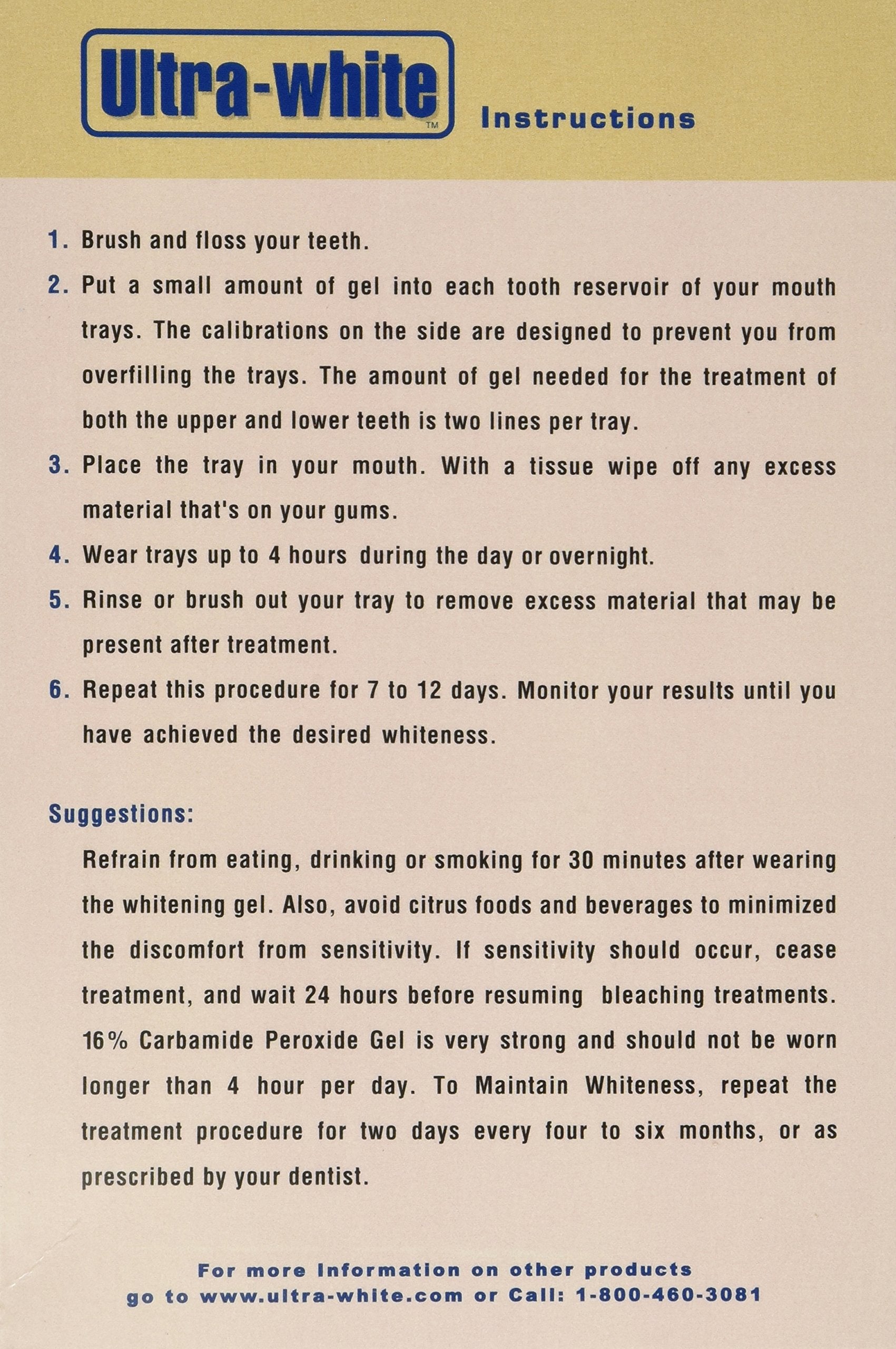 Imagine Beautiful white teeth in only a few days. Ultra white gel delivers professional dental office results without the dental office price. We include enough gel so that you will get results the first time without having to reorder in a few weeks. All gel is fresh with expiration date clearly marked. Ultra white is to be used in custom whitening trays or Invisalign Trays. Will not whiten caps, crowns, veneers, fillings or dentures.Store in cool place.See insert for more information. With all teeth whitening products you may experience tooth sensitivity and/or gum discomfort. These effects are generally mild. These effects are temporary and not harmful All teeth whitening gels will whiten teeth. The final results from a higher concentration gel are NOT BETTER, it may be faster but the end result is the same. So you can get the same result with Ultra-White 16% as you can with the 22% it will just take a little longer. But if you have sensitive teeth you will suffer from fewer side effects. As the whitening gel increases in concentration more side effects develop such as sensitivity to temperatures and sensitivity to the gel itself. ALL of these side effects are temporary as long as the gel concentration is below 22If you've ever dreamed of a dazzling teeth and a whiter smile don't put off placing your order. Click Add to Cart Today...since we stand behind all of our products with a 100% money-back guarantee you have nothing to lose.