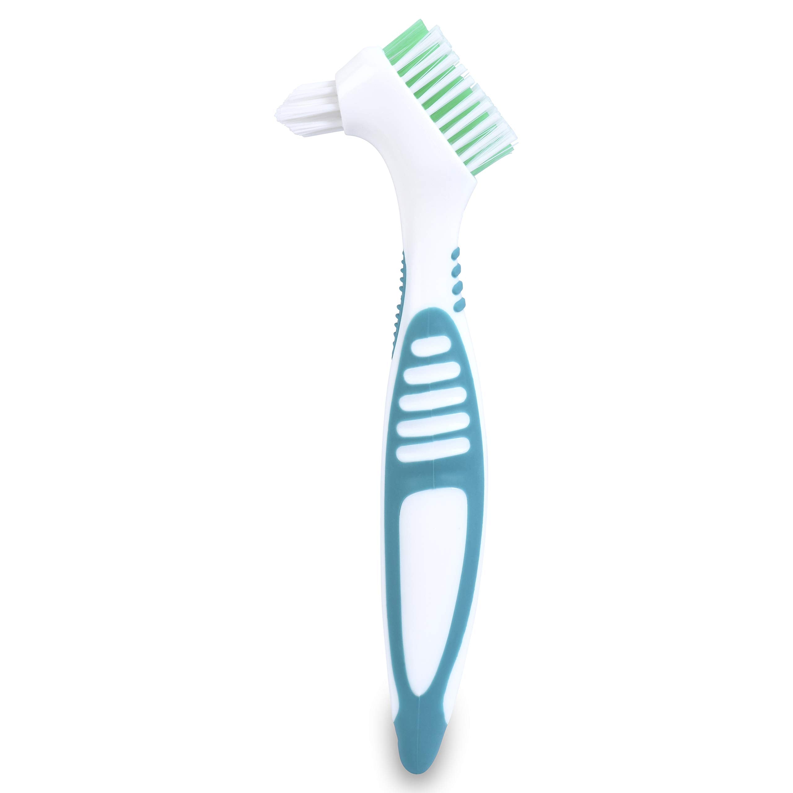 • The included ergonomically designed denture brush helps denture cleaning more effective and thorough. The nylon bristles are cut to brush the flat surfaces of your denture with a flip side for easy access to cleaning in spaces between your teeth.