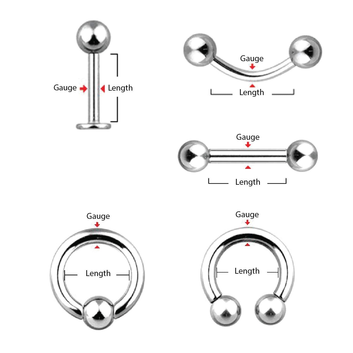- JEWELRY: Ball Closure Rings (BCR) 14G, Circular Horseshoe Barbells (CBR) 14G, 16G, Curved Barbells (CR) 14G, 16G, Labret Studs 16G, Straight Barbells 14G, 16G. COLOR: Silvertone, Rainbow.