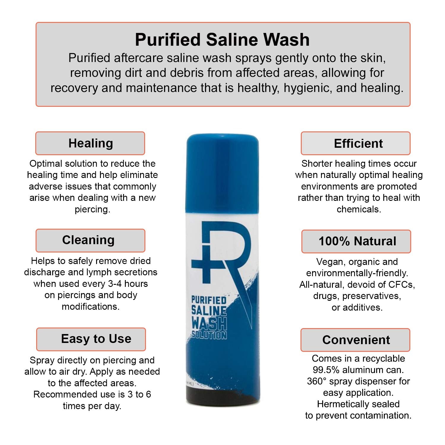 - AFTERCARE: Soothe, Refresh, and Clean Both New and Healed Piercings. Saline Wash Sprays Gently onto the Skin, Removing Dirt and Debris from Affected Areas on Skin, Allowing for Recovery and Maintenance Healthy, Hygienic, and Healing.