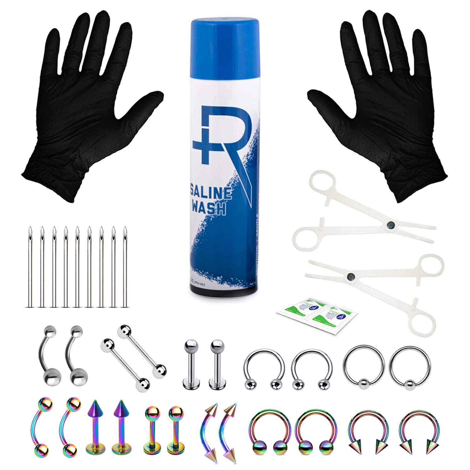 * **5** Hollow Piercing Needles 14G * **2** Ball Closure Rings 14G * **2** Straight Barbells 14G * **2** Circular Horseshoe Barbells 14G * **2** Curved Barbells 14G * **5** Hollow Piercing Needles 16G * **4** Circular Horseshoe Barbells 16G * **4** Curved Barbells 16G * **4** Labret Studs 16G * **2** Piercing Disposable Clamps * **4** Black Latex Gloves * **FREE** Alcohol Pads * **1** Bottle (1.5oz) of 100% Pure Saline Wash