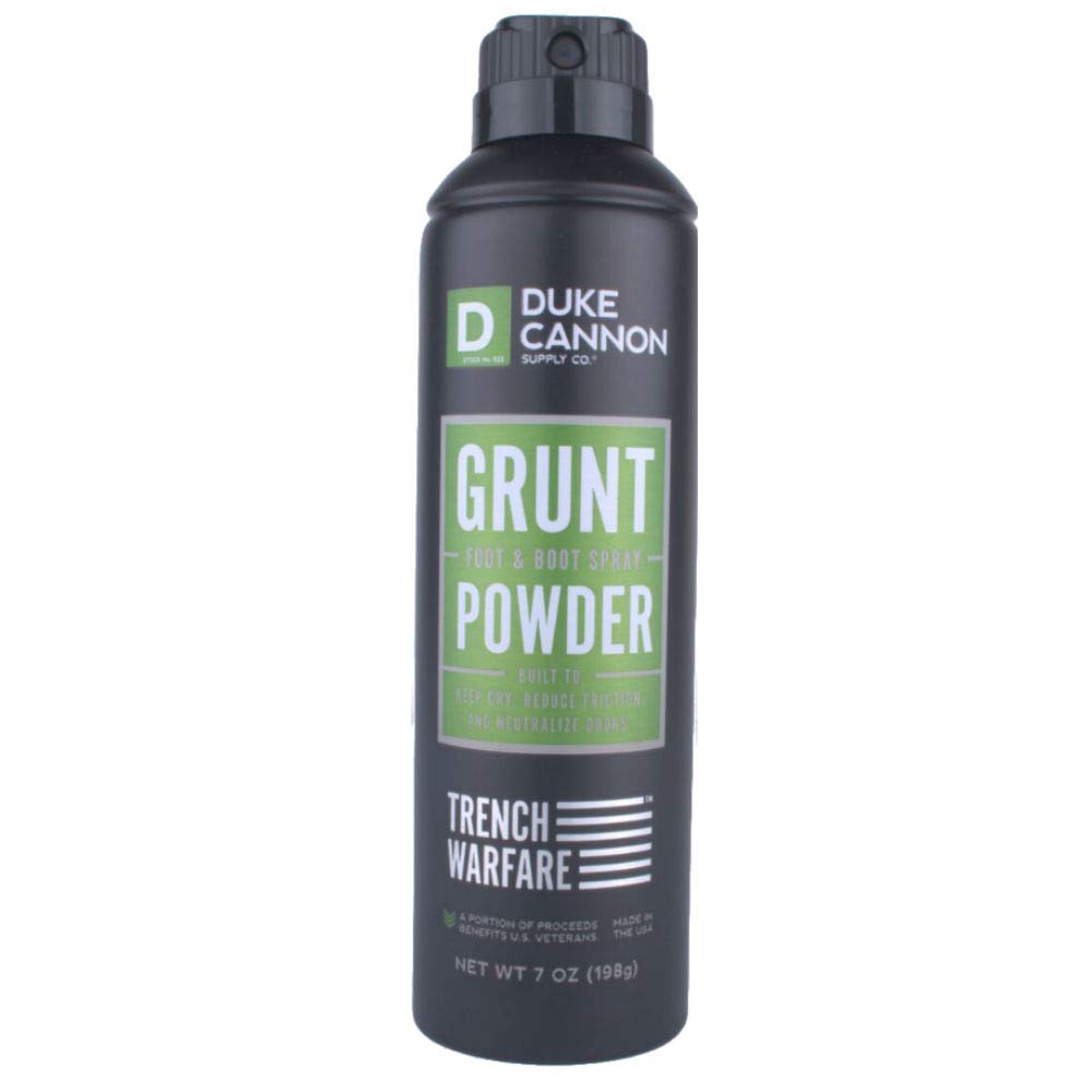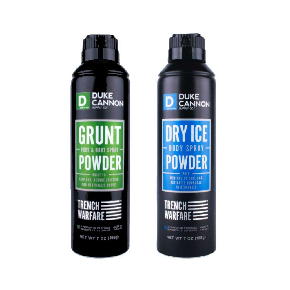 Duke Cannon Men's Trench Warfare Powder Spray Set: This powder spray combo will keep you fresh from head to toe. Hard working men know things can get a bit swampy down in the trenches. Formulated to meet the demands of 12-hour work days, not 45-minute tennis lessons.*Tested and approved by active duty soldiers. | Paraben-free || (1) Dry Ice Body Powder Spray, 7oz: Activated charcoal to deodorize, menthol and eucalyptus oil to cool, aloe vera and calamine to soothe. Duke Cannon Dry Ice Powder Spray is designed to keep you cool and dry where it counts. Activated charcoal and eucalyptus helps eliminate threats of swamp crotch, hockey stench, bat wings, trucker butt, and sweat marks. || (1) Grunt Foot & Boot Powder Spray, 7oz: Grunt Powder Spray is designed to keep your feet dry, friction-free, and smelling correct. For direct use on your feet or in your socks, shoes, and boots. Made with tapioca starch to keep dry and superior grade talc sourced from the Rocky Mountain foothills of Montana. || A Portion of Proceeds Benefits U.S. Veterans. || Cruelty-Free. Our products are never tested on animals, just bad interns. | Made in the USA.