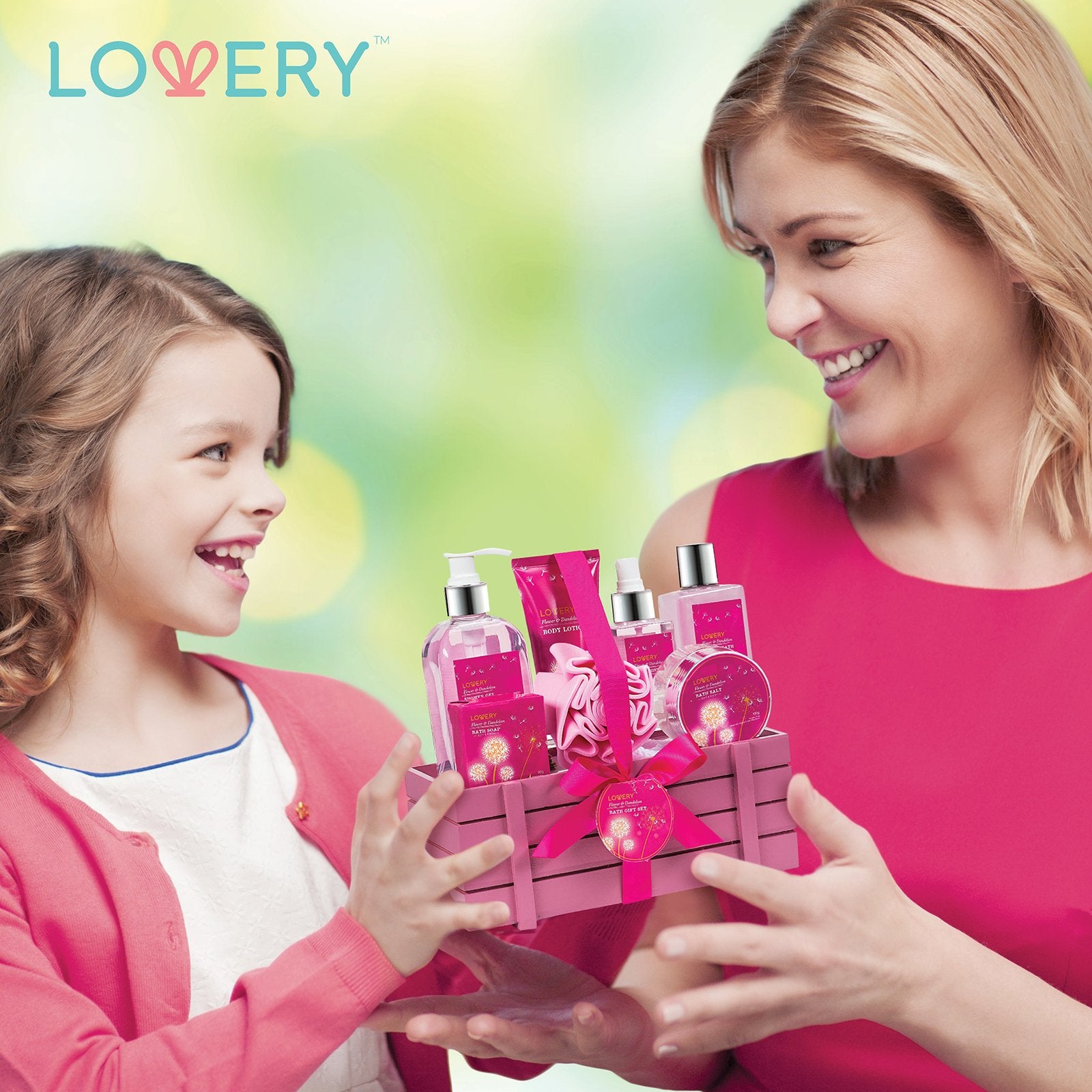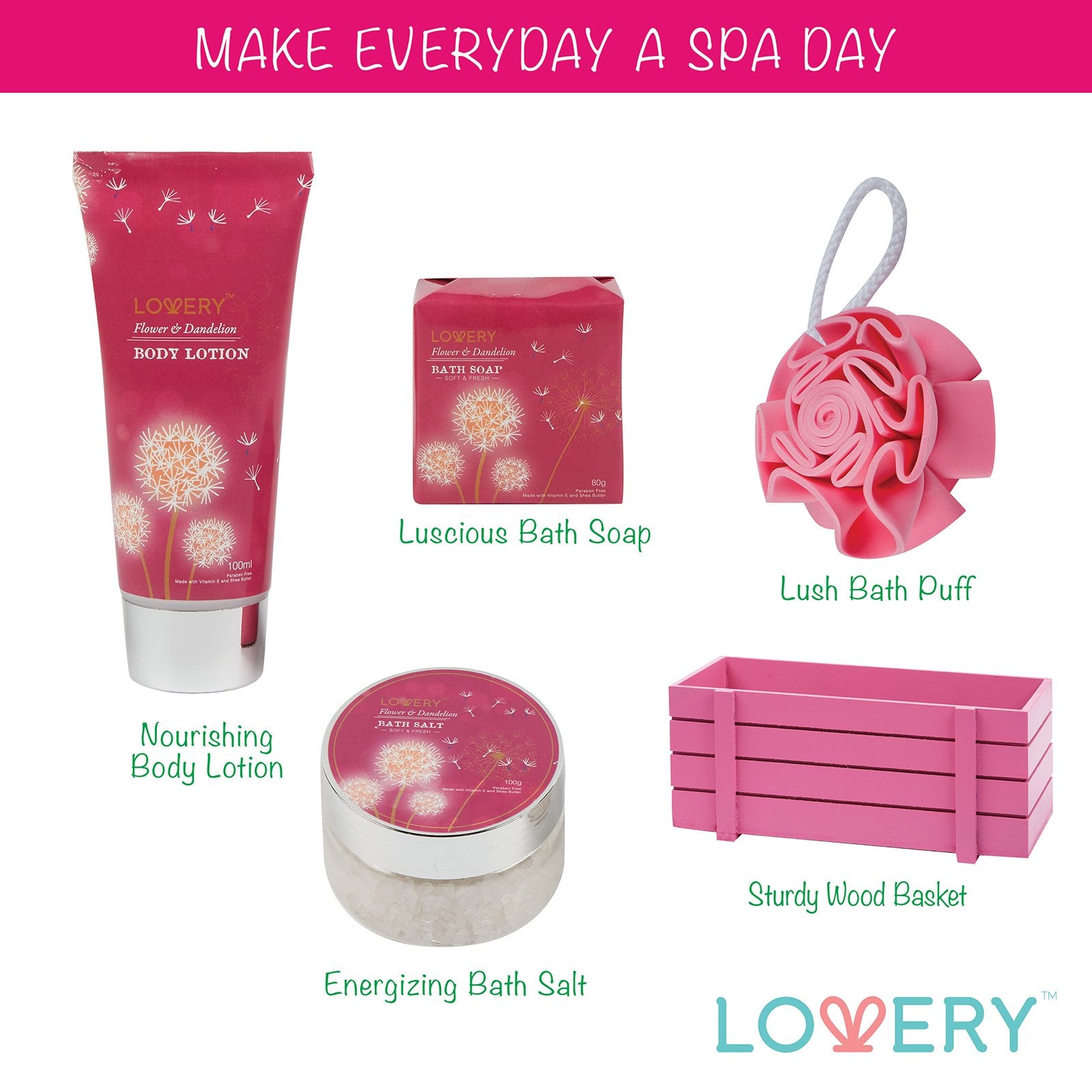 * Flower & Dandelion is a sensational fragrance with crisp floral notes * Full 8 piece set contains an assortment of lush bath accessories * Beautifully wrapped & packaged for the ultimate presentation with a ribbon & tag * Blank lined gift note attached to write her a heartfelt message * Formulated with Shea Butter & Vit E to moisturize & protect * Purely sourced ingredients, clearly displayed on packaging * Lovery's items are Paraben-Free and Never Tested on Animals * 100% Satisfaction Guarantee - love it or your money back!