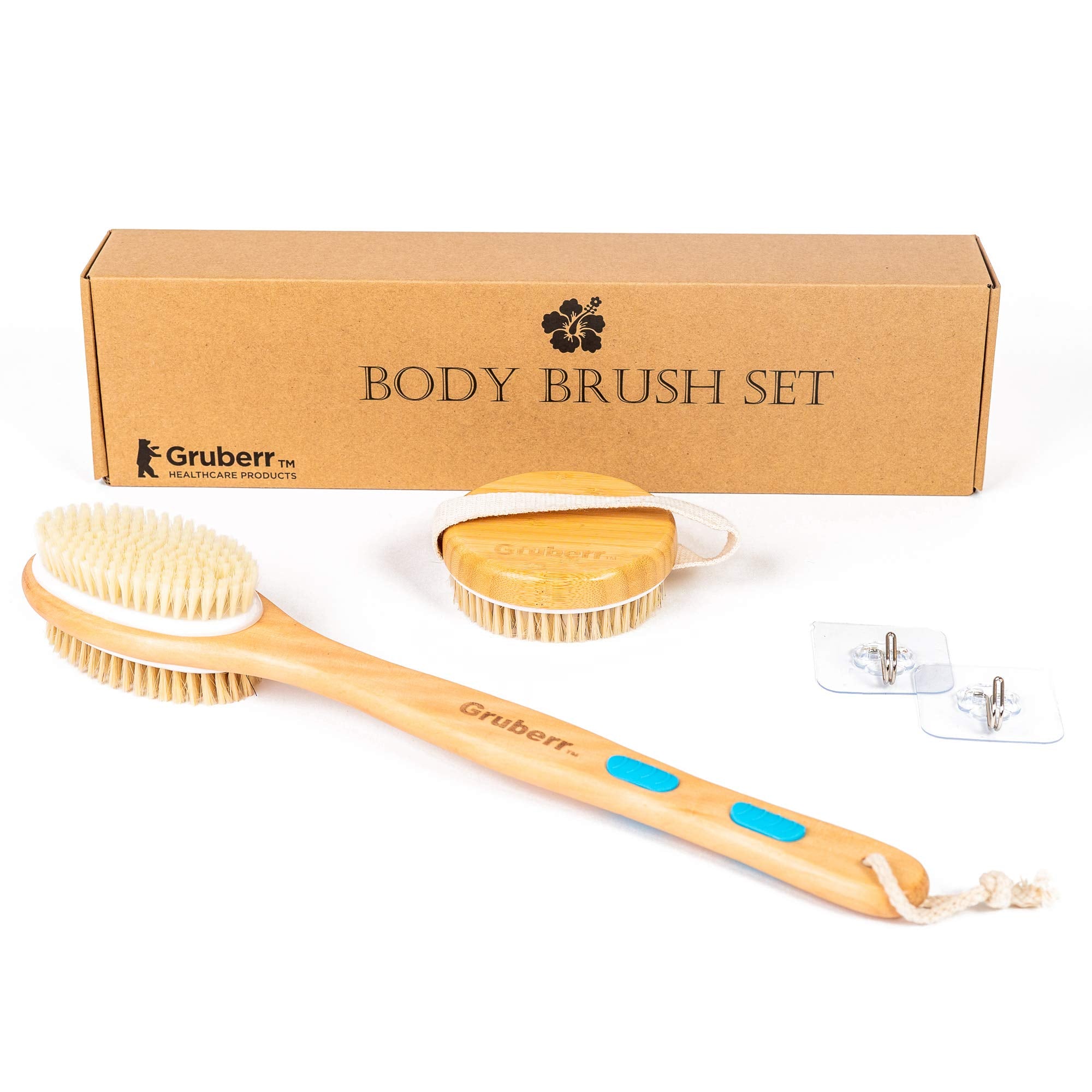 Gruberr Bath Body Brush Set - for Glowing Skin, Soft and Stiff Bristles, Short and Long Brushes for Easy Reach, Dry or Wet Brushing - Cellulite, Lymphatic, Exfoliating - Men, Women, Elderly - w/hooks