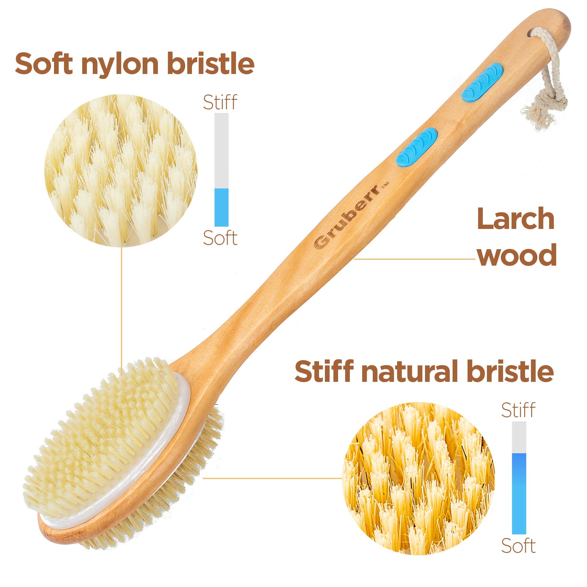 - FOR ALL SKIN TYPES – The long handle double sided shower back brush comes with stiff natural boar bristles on one side for exfoliation and soft nylon bristles on the other for dry or wet brushing.