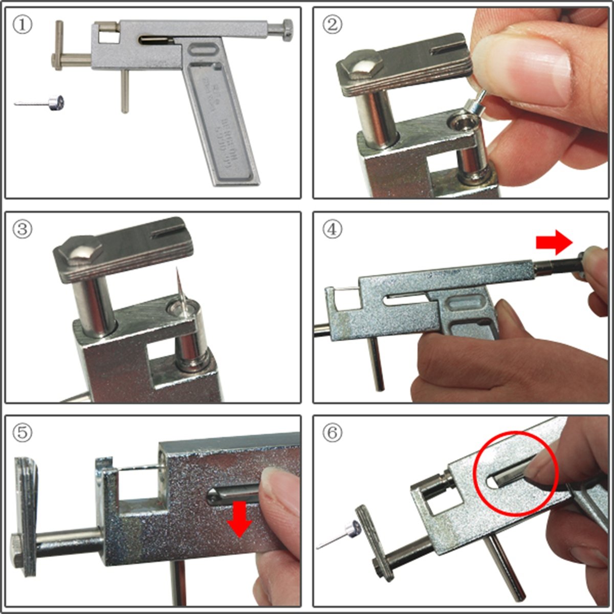 Put a ear stud in the adaptor Pull back the tension regulator to the 'Locked' position Put the gun to ear and aim the position (earlobe) Hold the trigger to back the ear stud cradle and press 'FIRE' Clean up both the gun and studs before and after use