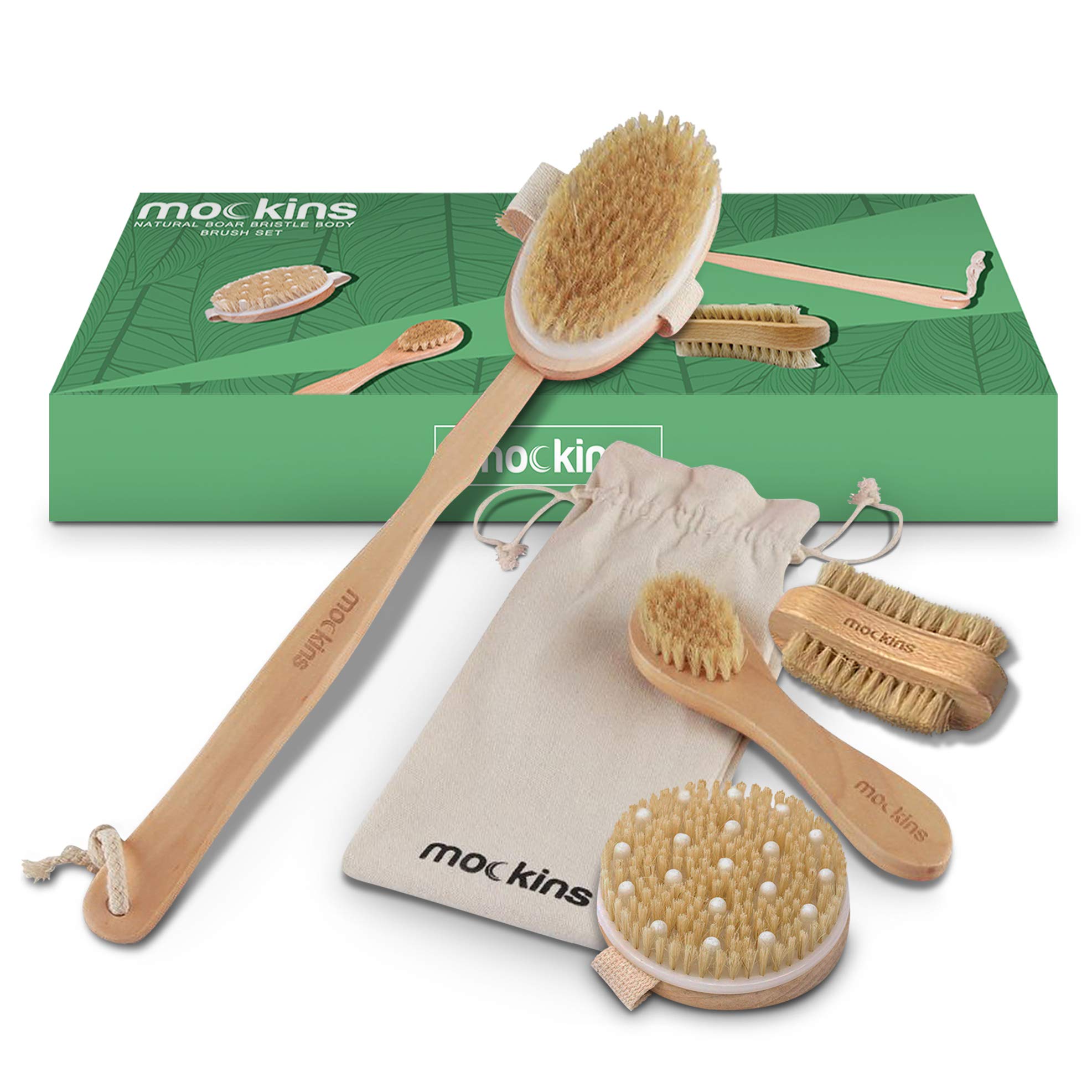 Mockins Natural Boar Bristle Body Brush Set with Detachable Cellulite Massage Brush and Long Wooden Handle for Dry Brushing Perfect Kit to Exfoliate and Get Rid of Cellulite - Gift Set