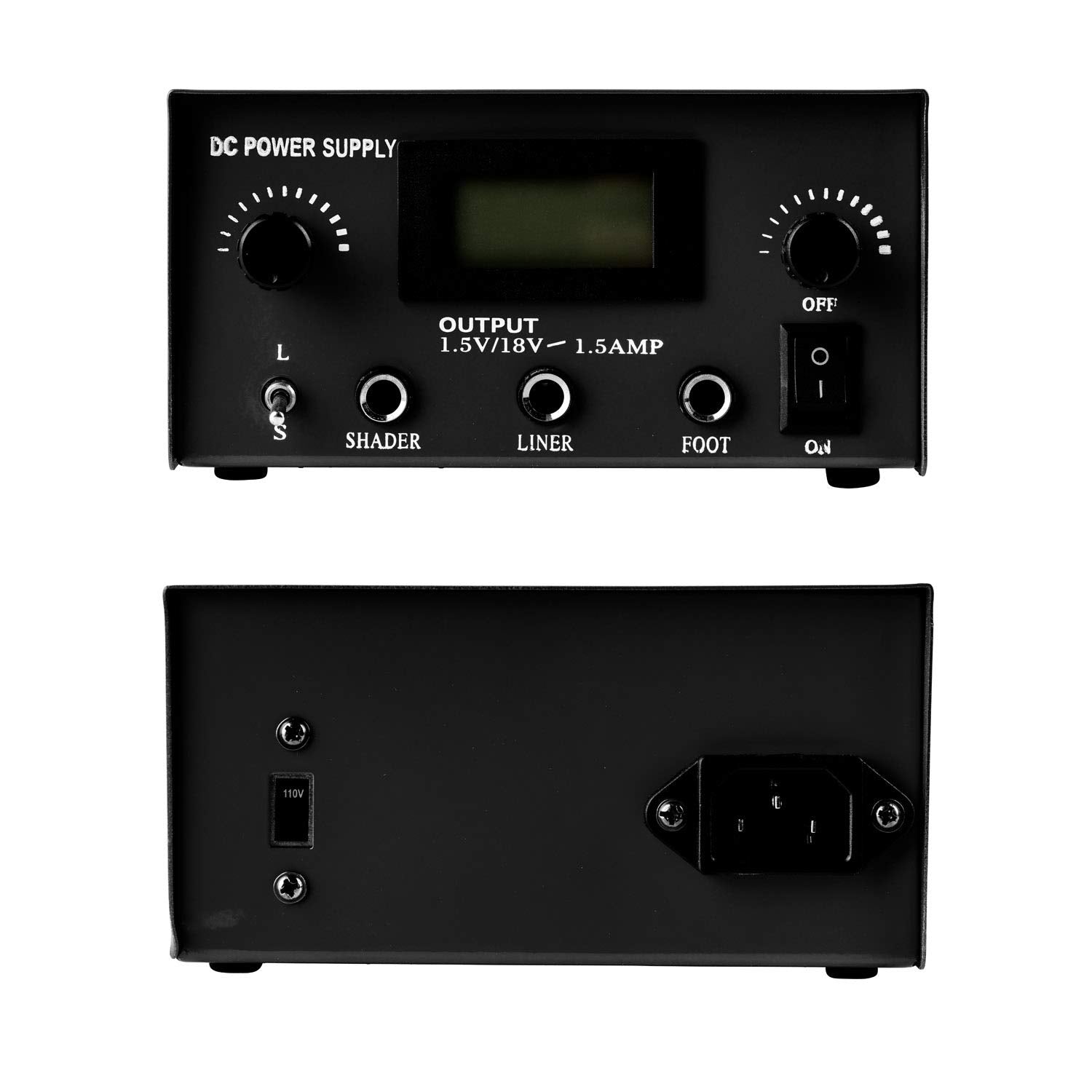 • POWER SUPPLY FOR TATTOO MACHINES: This power supply unit comes complete with 1 power cord, 1 pedal and 2 clip cords. The LCD display reads out the voltage as the machine runs and has a programmable preset function. This power supply box works with rotary tattoo machines, tattoo guns, and other types of machines. This unit comes with all the parts you need to get down to tattooing.