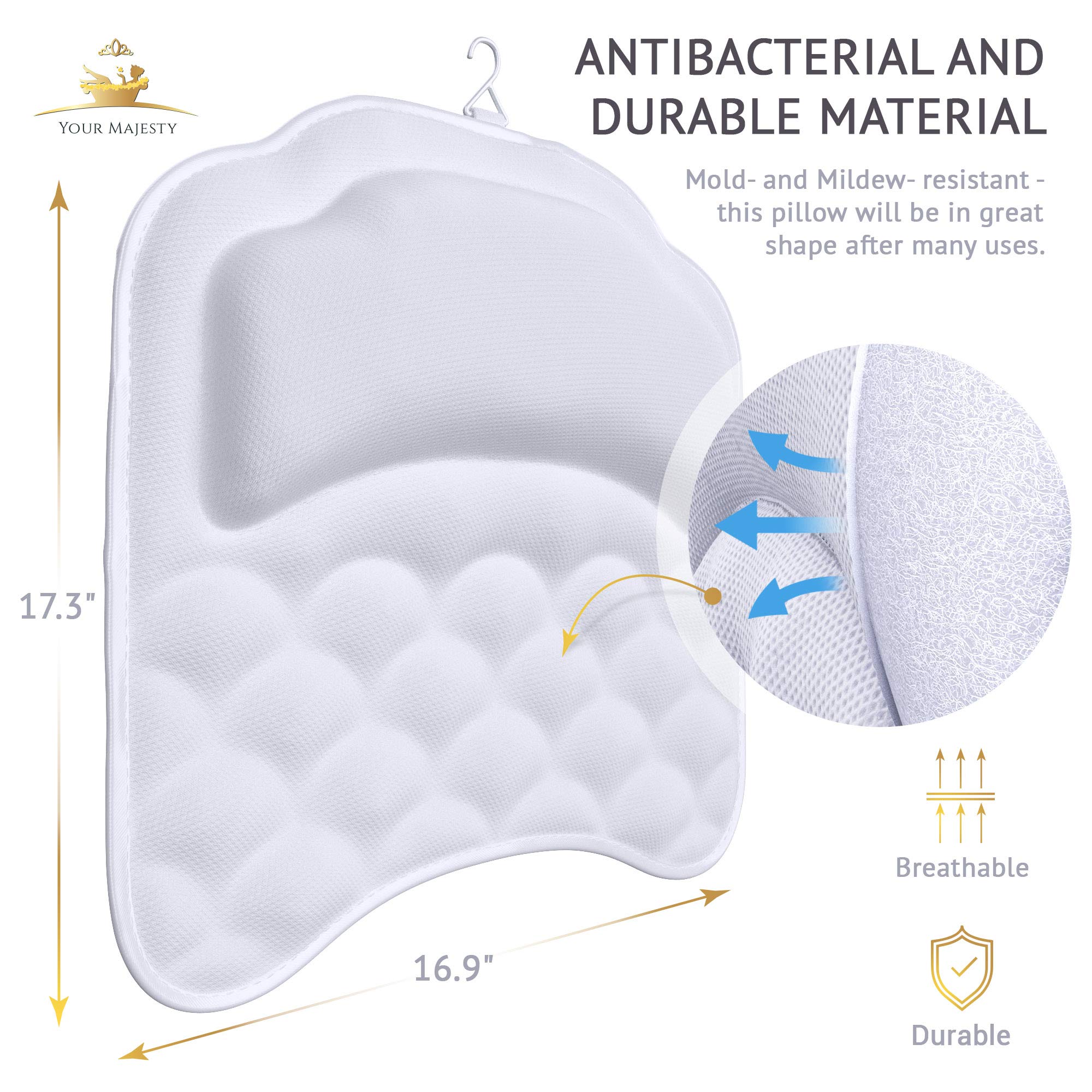 • Cooling effect. Your Majesty Bath Pillow is made of breathable mesh fabric that will make you feel comfortable and refreshing while bathing. Hence, there is zero chance that it will get hot or soggy. Besides, it allows the pillow to dry pretty fast