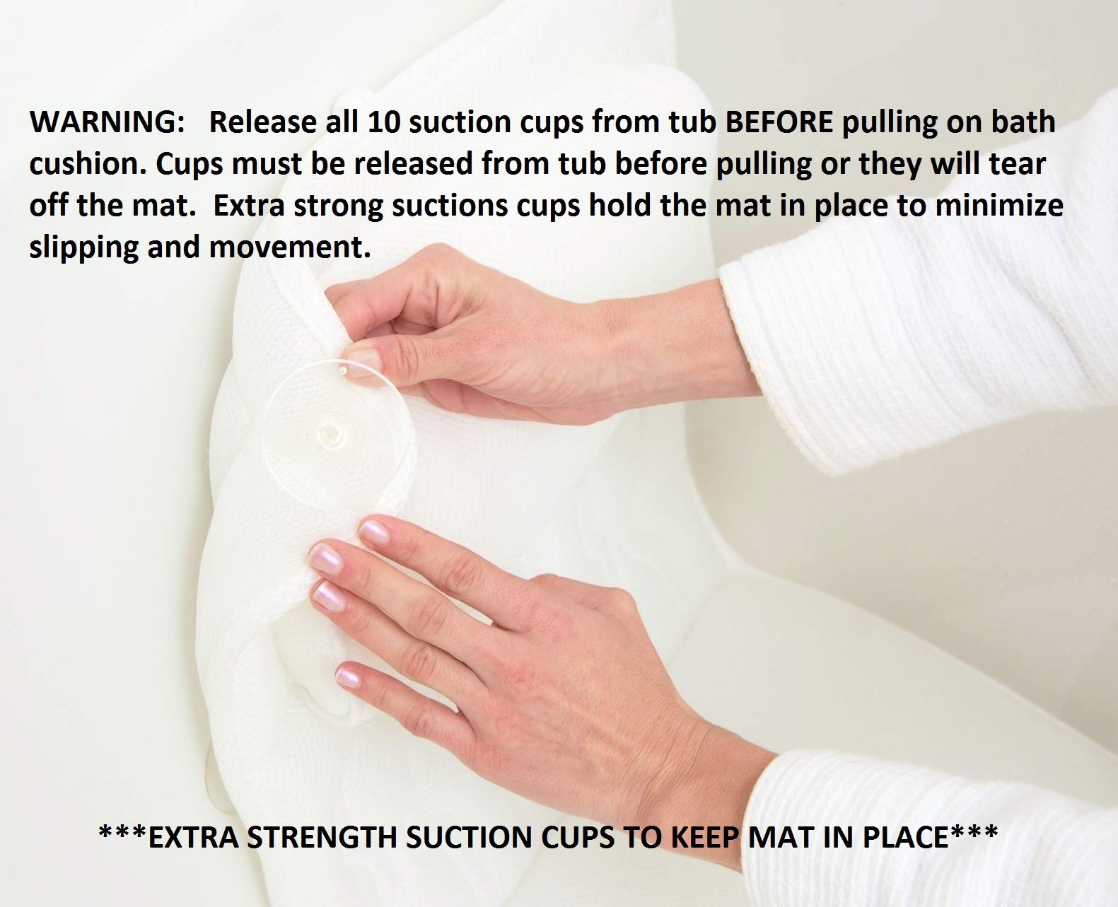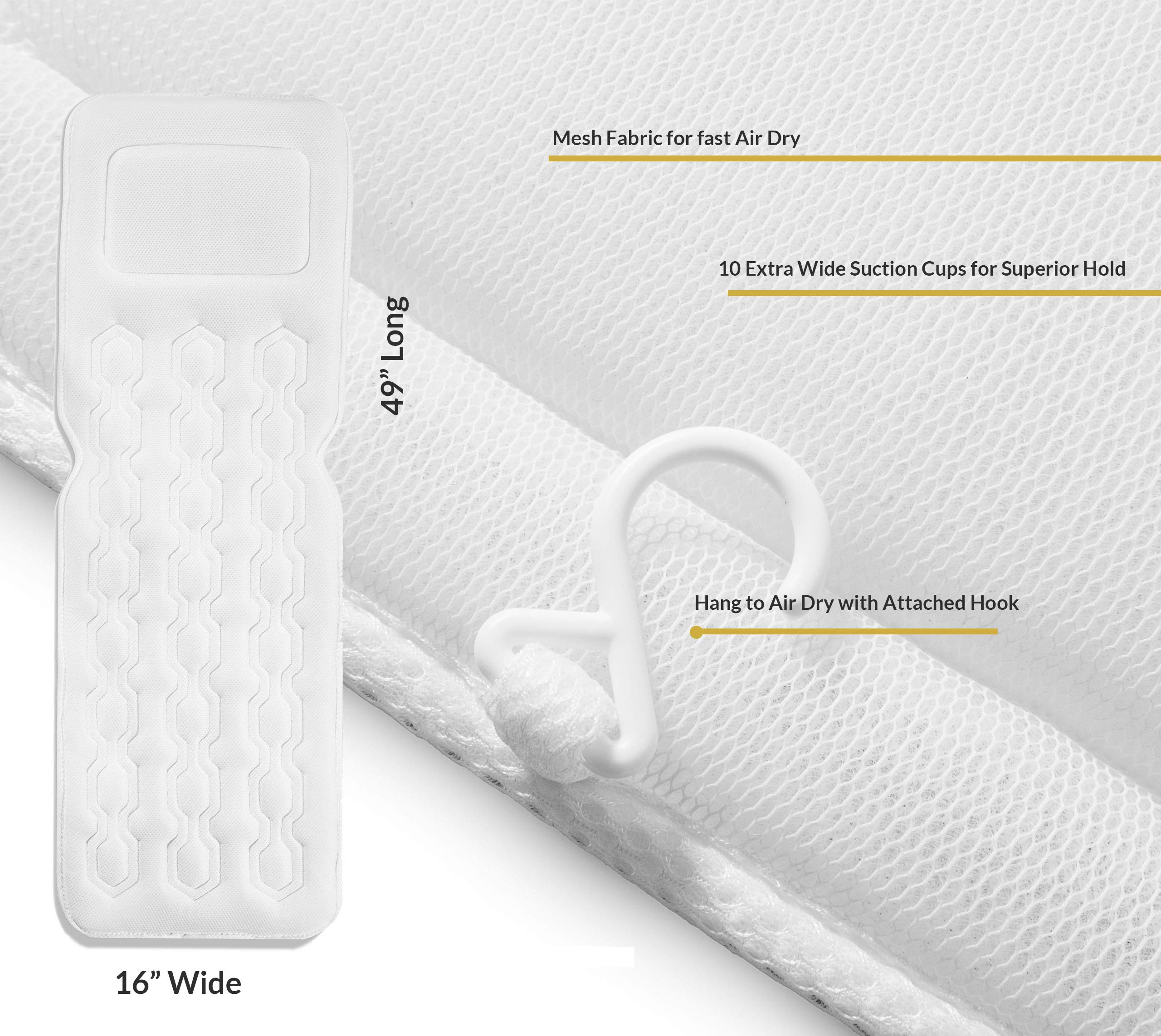 - SUPERIOR COMFORT AND SUPPORT- This full body bath mat is soft but also supportive. The one-piece bath cushion reduces the pressure on your back, shoulders, and tailbone. It measures 16” x 49” with 10 extra wide suction cups for a sturdy grip