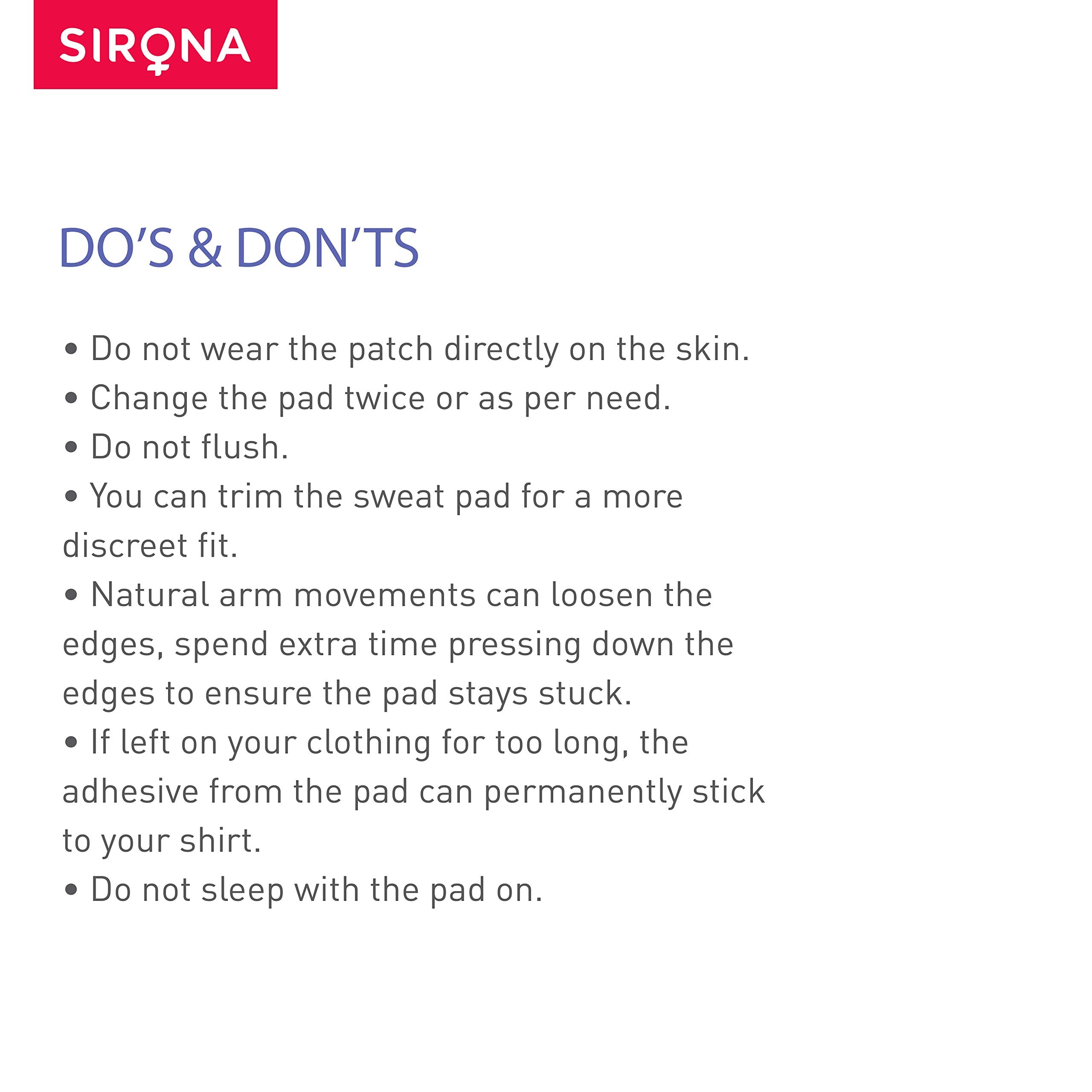 We all sweat, but, few of us have real sweating issues. For those who sweat excessively, we now have Sirona’s ‘Underarm Sweat Pads’ to become your new best friend. With our easy to use, anti-stain disposable pads you don’t need to worry about stains & embarrassment. Just put Sirona’s ‘Anti Stain: Sweat Pads’ on the garment and forget sweat stains. These are simple to use garment liners and come with a self-adhesive glue. Just inverse your shirt and stick the sweat pad on the underarm area. The sweat pads really save the embarrassment of sweat stains and smell. These are suitable for all garments & can be used by both males & females. If you are sick of yellow stain lines on your attire Sirona's Anti Stain: Sweat pads will really save you from the shame and awkwardness.