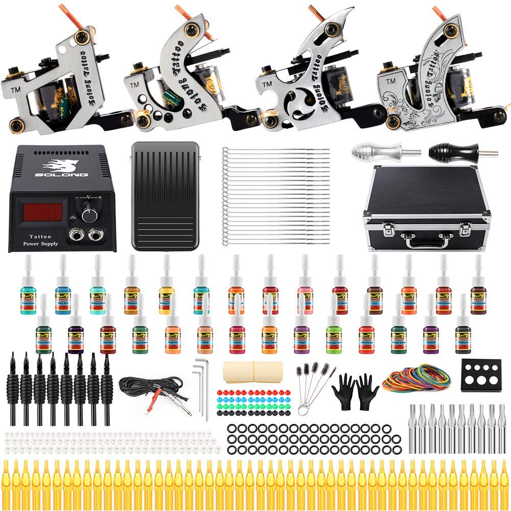 4 Pro tattoo machine guns for liner and shader, 28 popular tattoo ink colors, bright and safe to start your tattoo working LCD digital tattoo power supply with foot pedal and clips cord, more easier to control the voltage, more accurately to control your tattoo rhythm 50 tattoo needles, 60...