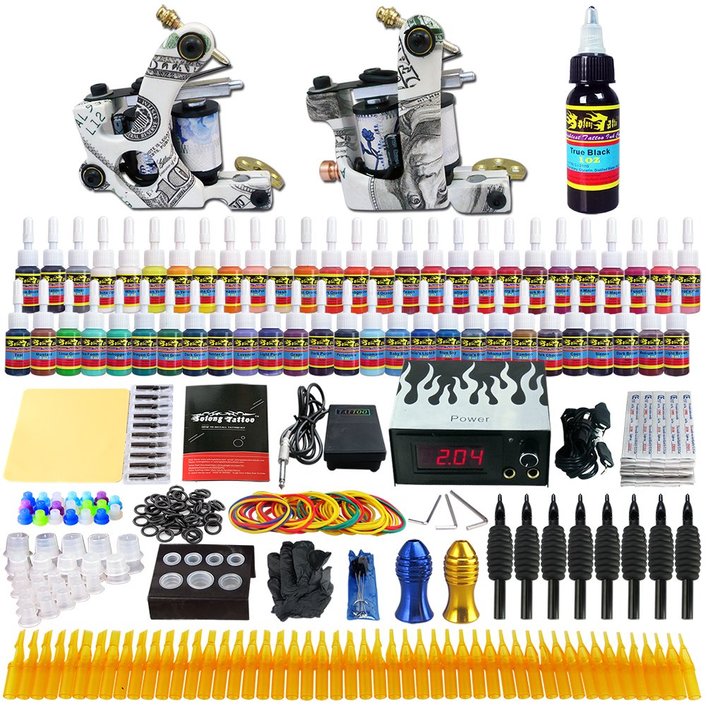 Solong Tattoo® Complete Tattoo Kit 2 Pro Machine Guns 54 Inks Power Supply Foot Pedal Needles Grips Tips TK271